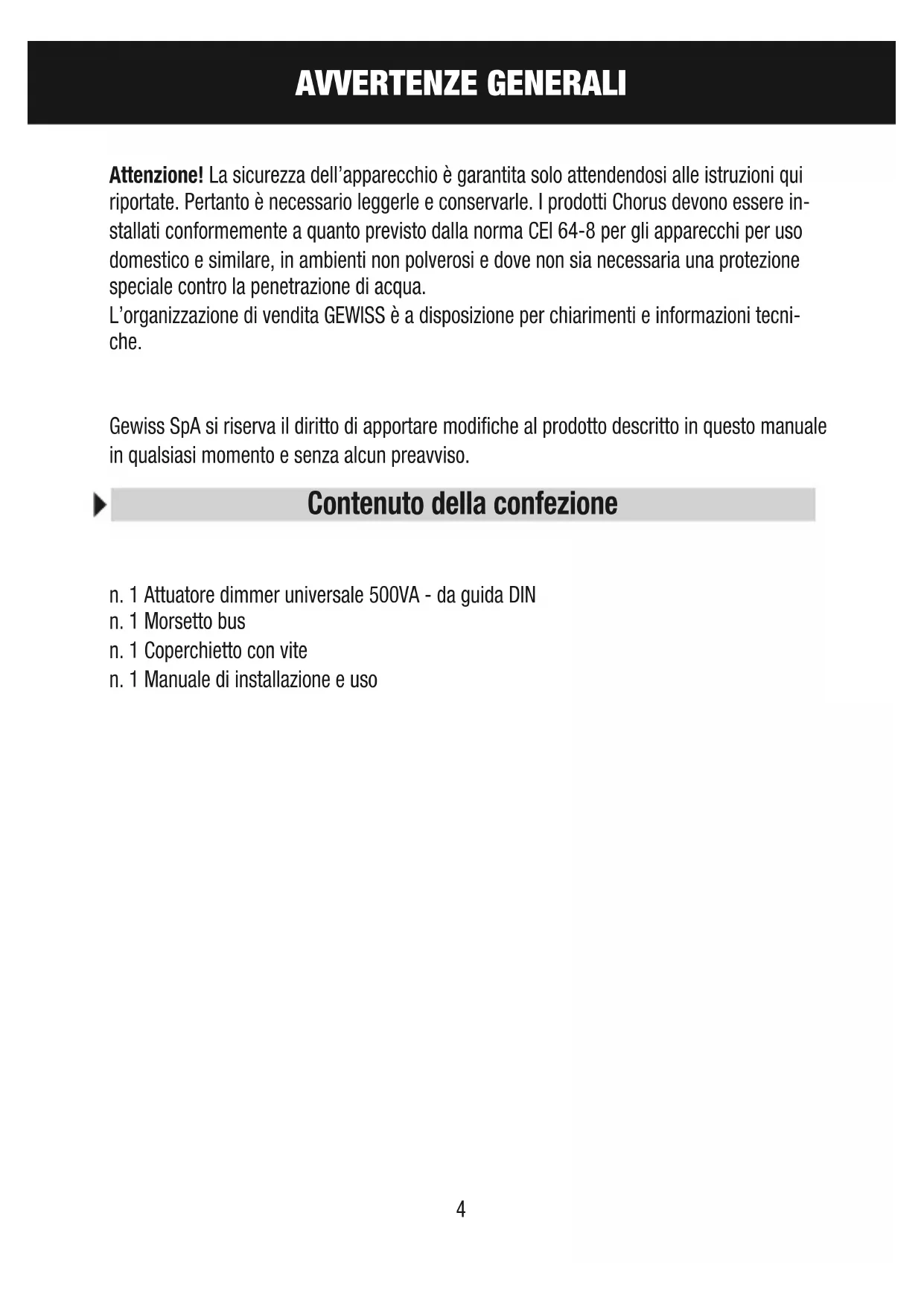 Attenzione! La sicurezza dell'apparecchio è garantita solo attendendosi alle istruzioni qui riportate. Pertanto è necessario leggerle e conservarle. I prodotti Chorus devono essere installati conformmente a quanto previsto alla norma CEI 64-8 per gli apparecchi per uso domestico e similare, in ambienti non polverosi e dove non sia necessaria una protezione speciale contro la penetrazione di acqua.