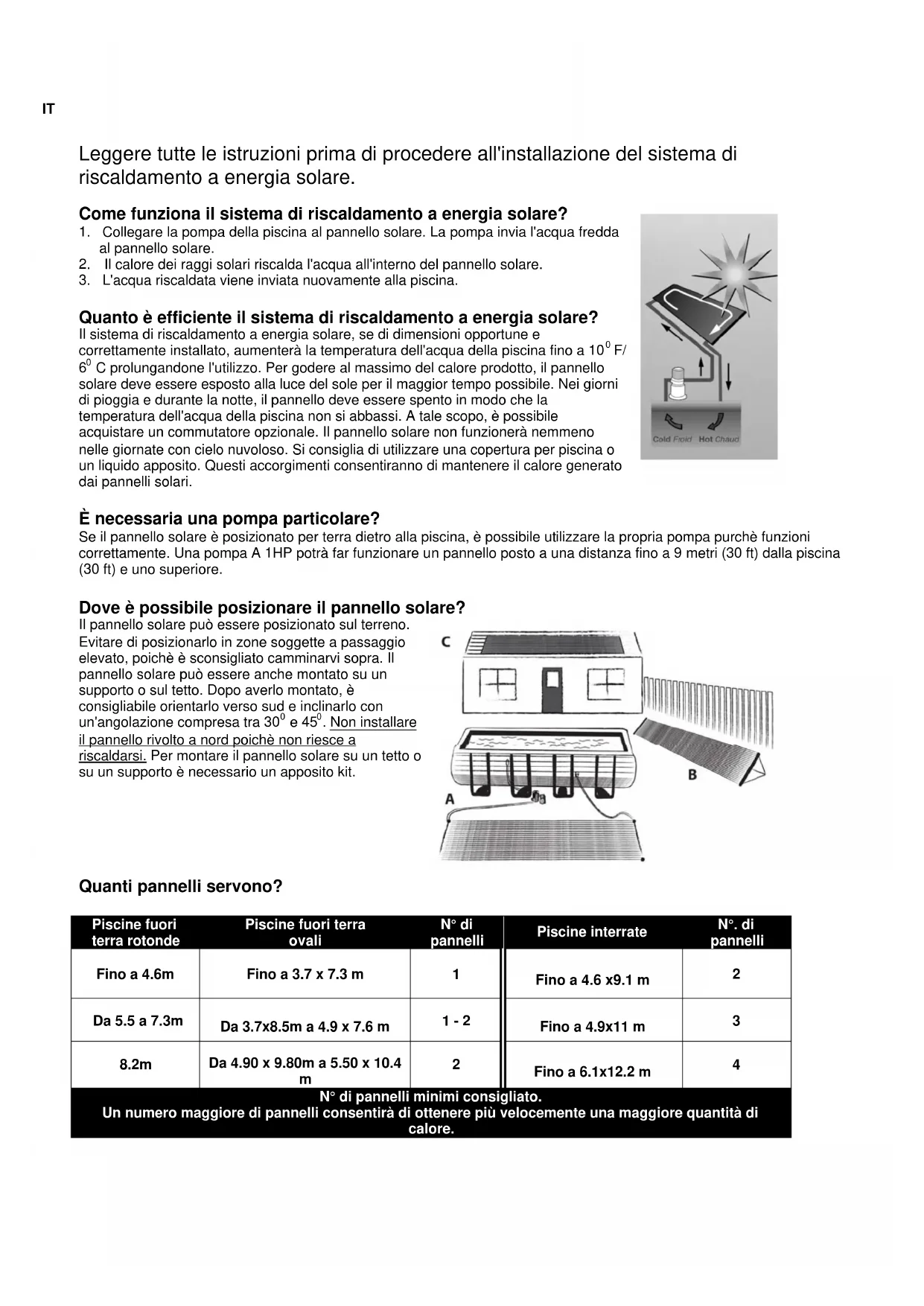 C prolungandone l'utilizzo. Per godere al massimo del calore prodotto, il pannello solare deve essere esposto alla luce del sole per il maggior tempo possibile. Nei giorni di pioggia e durante la notte, il pannello deve essere spento in modo che la temperatura dell'acqua della piscina non si abbassi. A tale scopo, è possibile acquistare un commutatore opzionale. Il pannello solare non funzionerà nemmeno nelle giornate con cielo nuvoloso. Si consiglia di utilizzare una copertura per piscina o un liquido apposito. Questi accorgimenti consentiranno di mantenere il calore generato dai pannelli solari. È necessaria una pompa particolare? Se il pannello solare è posizionato per terra dietro alla piscina, è possibile utilizzare la propria pompa purchè funzioni correttamente. Una pompa A 1HP potrà far funzionare un pannello posto a una distanza fino a 9 metri (30 ft) dalla piscina (30 ft) e uno superiore. Dove è possibile posizionare il pannello solare? Il pannello solare può essere posizionato sul terreno. Evitare di posizionarlo in zone soggette a passaggio elevato, poichè è sconsigliato camminarvi sopra. Il pannello solare può essere anche montato su un supporto o sul tetto. Dopo averlo montato, è consigliabile orientarlo verso sud e inclinarlo con un'angolazione compresa tra 30