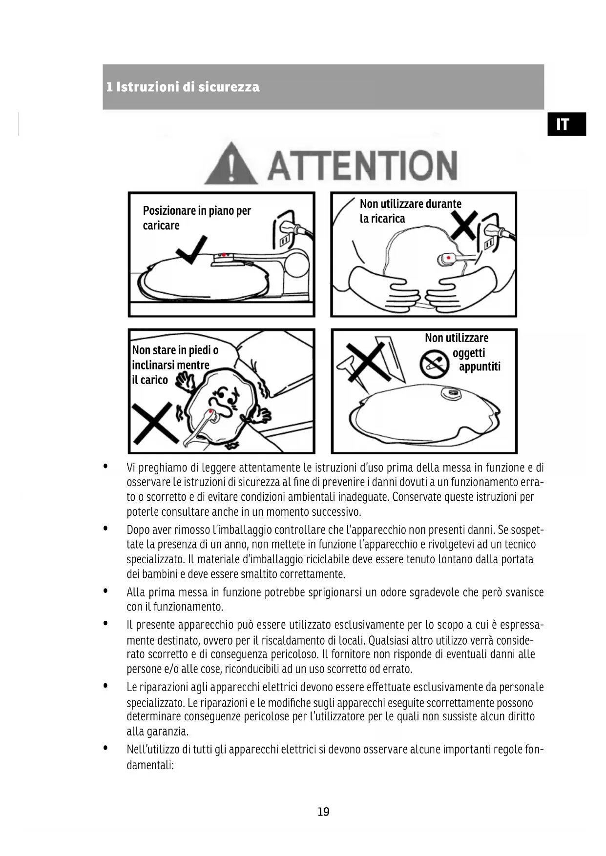 • Vi preghiamo di leggere attendamente le istruzioni d'uso prima della messa in funzione e di osservare le istruzioni di sicurezza al fine di prevenir i danni dovuti a un funzionamento errato o scorretto e di evitare condizioni ambientali inadequate. Conservate queste istruzioni per poterle consultare ancche in un momento successivo.