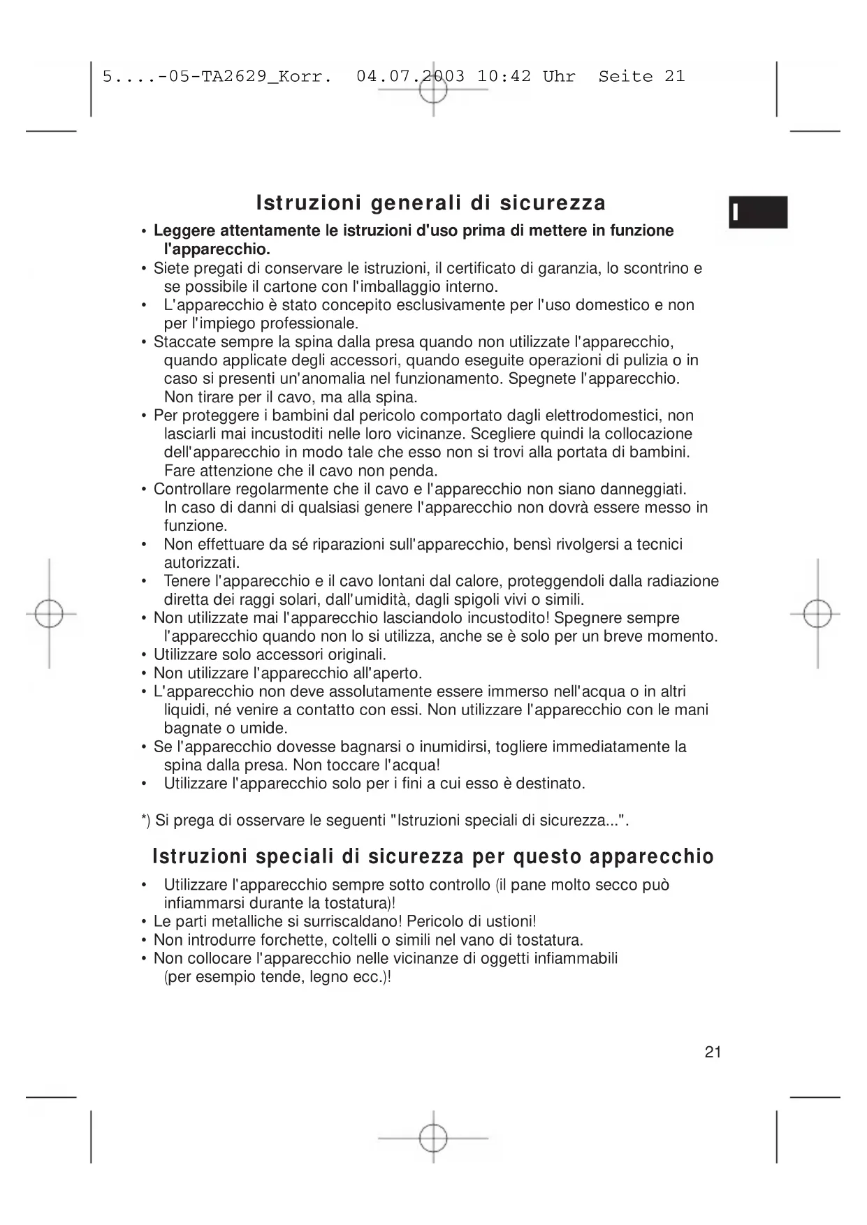 - Estrarre il cassetto delle briciole tirandolo per la linguetta, eliminare i resti di pane e introdurre nuovamente il cassetto. Questo apperecchio è conforme alle disposizioni CE vigenti ed è stato costruito in ottemperanza alle più moderne regole di sicurezza. Ci si riserva il diritto di apportare modifiche tecniche. Garanzia Forniamo sull'apparecchio da noi venduto una garanzia di 24 mesi a partire dalla data di acquisto (scontrino). Entro il periodo della garanzia risolviamo gratuitamente, con la riparazione o a nostra discrezione con la sostituzione dell'apparecchio, i difetti che sono da ricondursi a difetti di materiale o di fabbricazione. Le prestazioni di garanzia non implicano un prolungamento del termine di scadenza della garanzia, né danno ini- zio ad un nuovo periodo di garanzia! Per la garanzia è necessaria la ricevuta di acquisto. Senza di essa non sarà possibile né la sostituzione, né la riparazione gratuita. In caso di garanzia consegnate al Vostro rivenditore l'apparecchio completo, nella confezione originale, unitamente allo scontrino. Accessori difettosi non comportano la sostituzione dell'intero apparecchio; nuovi accessori vengono spediti gratuitamente in cambio di quelli difettosi. In questo caso non spedire l'apparecchio, bensì ordinare solo l'accessorio difettoso! Le rotture di vetro sono sempre a pagamento! Sia i difetti agli accessori di consumo e alle parti soggette ad usura (per esempio carboncini del motore, fruste per impastare, cinghie di trasmissione, telecomandi di ricambio, spazzolini di ricambio, lame di sega ecc.), sia la pulizia, la manutenzione o la sostituzione di parti soggette ad usura non sono incluse nella garanzia e sono quindi a pagamento! La garanzia decade in caso di interventi di terzi. Dopo la garanzia Una volta scaduto il periodo di garanzia si potranno richiedere riparazioni a pagamento al rivenditore specializzato o al servizio Riparazioni. 5....-05-TA2629_Korr. 04.07.2003 10:42 Uhr Seite 2324