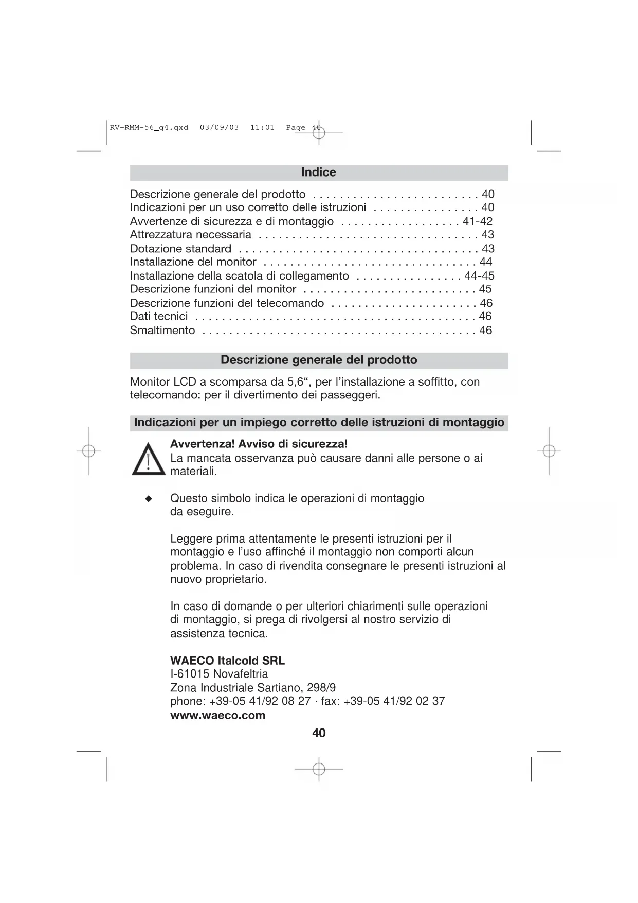 Avvertenze di sicurezza e di montaggio Attenzione! WAECO International non risponde dei danni dovuti a: a) errori di montaggio b) danneggiamenti al sistema dovuti ad influssi meccanici e sovratensione c) modifiche effettuate all’apparecchio senza espressa autorizzazione da parte di WAECO International d) uso non conforme a quello descritto nelle istruzioni di montaggio. RV-RMM-56_q4.qxd 03/09/03 11:01 Page 424343 Attrezzatura necessaria Dotazione standard Per l’installazione ed il montaggio sono necessari: –riga (fig. B 1) – trapano (fig. B 5) –punteruolo (fig. B 2) – cacciaviti (fig. B 6) –martello (fig. B 3) – chiavi (fig. B 7) –punte da trapano (fig. B 4) Per il collegamento elettrico e i controlli sono necessari: –tester diodi (fig. B 8) - fon (aria calda) (fig. B 12) o voltmetro (fig. B 9) - saldatoio (fig. B 13) –pinza a crimpare (fig. B 10) - filo di stagno per saldare (fig. B 14) –nastro isolante (fig. B 11) A seconda del tipo di montaggio individuale, per il fissaggio possono essere necessarie ulteriori viti, dadi, rosette, viti Parker e fascette porta-cavo rispetto a quanto contenuto nella fornitura. Quantità Descrizione 1 Monitor LCD da 5,6“ nell’alloggiamento a scomparsa (fig. C 1) 1 Scatola di collegamento con cavo di connessione per il monitor e cavo di collegamento (alimentazione) (fig. C 2) 1Telecomando ad infrarossi, batterie incluse (fig. C 3) 1 Piastra di montaggio (fig. C 4) Materiale di montaggio 1 Istruzioni per l’uso ed il montaggio RV-RMM-56_q4.qxd 03/09/03 11:01 Page 4344 Installazione del monitor Installazione della scatola di collegamento Istruzioni generali di montaggio! Prima di montare il monitor eseguire le seguenti operazioni: