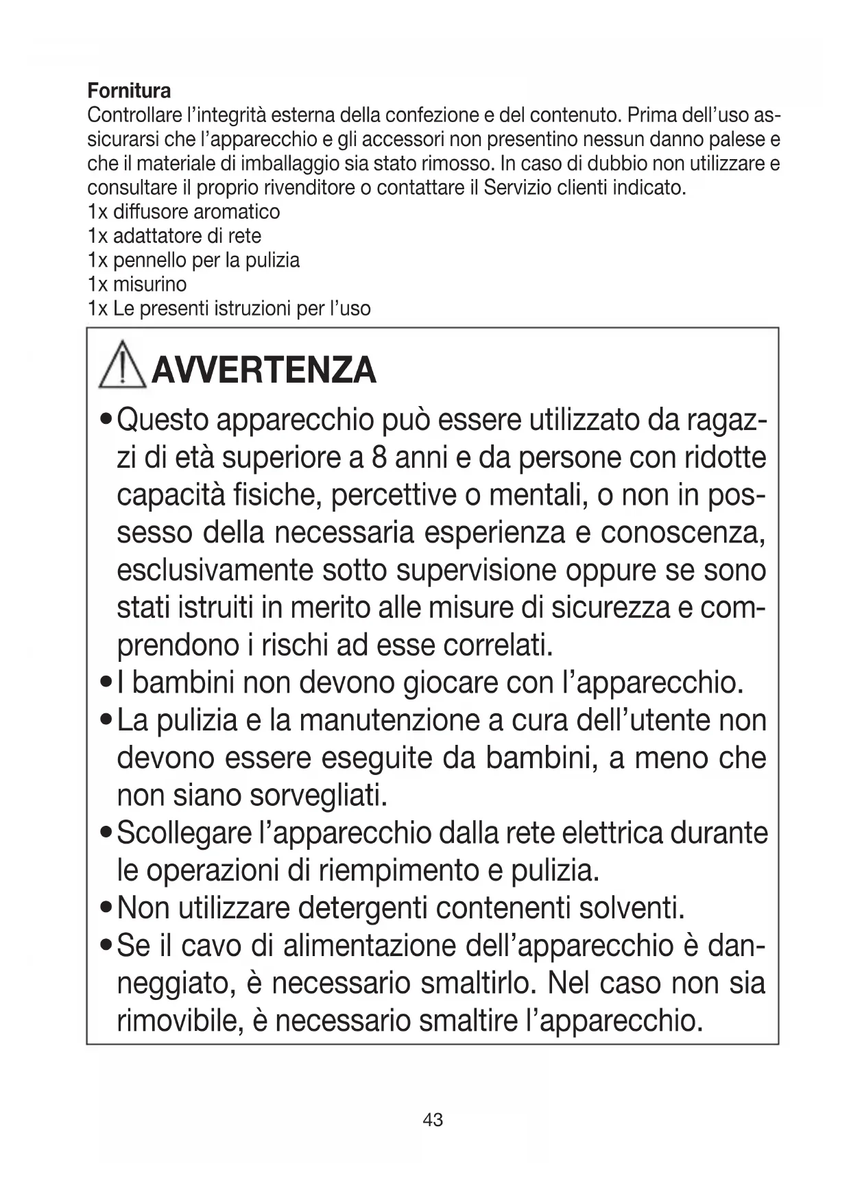 Se il cavo di alimentazione dell’apparecchio è dan- neggiato, è necessario smaltirlo. Nel caso non sia rimovibile, è necessario smaltire l’apparecchio.44 1 Spiegazione dei simboli I seguenti simboli sono utilizzati nelle Istruzioni per l’uso e sull’apparecchio: AVVERTENZA Segnalazione di rischio di lesioni o pericoli per la salute ATTENZIONE Segnalazione di rischi di possibili danni all’apparecchio/agli accessori Nota Indicazione di importanti informazioni Rispettare le istruzioni per l’uso. Smaltimento secondo le norme previste dalla Direttiva CE sui rifiuti di apparecchiature elettriche ed elettroniche (RAEE). Il presente prodotto soddisfa i requisiti delle direttive europee e nazionali vigenti. Produttore 2 Uso conforme Il diusore aromatico è destinato unicamente a profumare l’ambiente. L’apparec- chio è destinato all’uso privato. Utilizzare l’apparecchio solo per lo scopo per il quale è stato concepito e come descritto nelle presenti istruzioni per l’uso. Qualsiasi uso non conforme comporta un pericolo! Il produttore non risponde di danni causati da un uso inappropriato o non conforme.45 3 Note Il mancato rispetto delle seguenti indicazioni può provocare danni alle persone e alle cose. Norme di sicurezza AVVERTENZA