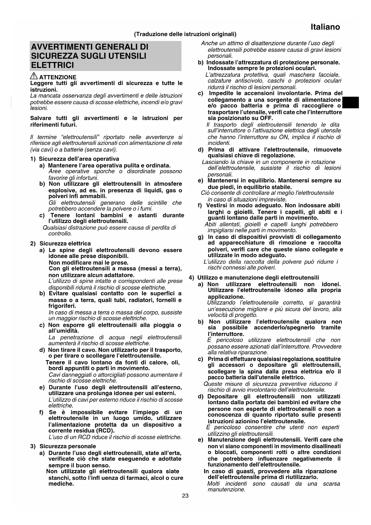 ELETTRICI ATTENZIONE Leggere tutti gli avvertimenti di sicurezza e tutte le istruzioni. La mancata osservanza degli avvertimenti e delle istruzioni potrebbe essere causa di scosse elettriche, incendi e/o gravi lesioni. Salvare tutti gli avvertimenti e le istruzioni per riferimenti futuri. Il termine “elettroutensili” riportato nelle avvertenze si riferisce agli elettroutensili azionati con alimentazione di rete (via cavi) o a batterie (senza cavi).