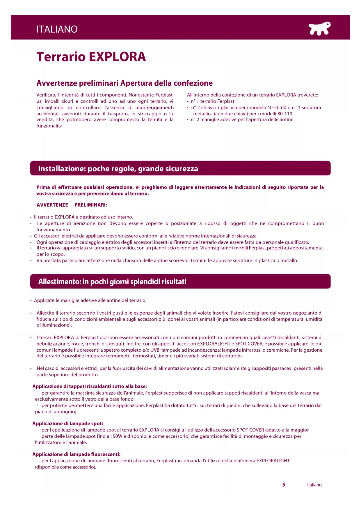 - per l'applicazione di lampade fluorescenti al terrario, Ferplast raccomanda l'utilizzo della plafoniera EXPLORALIGHT (disponibile come accessorio).