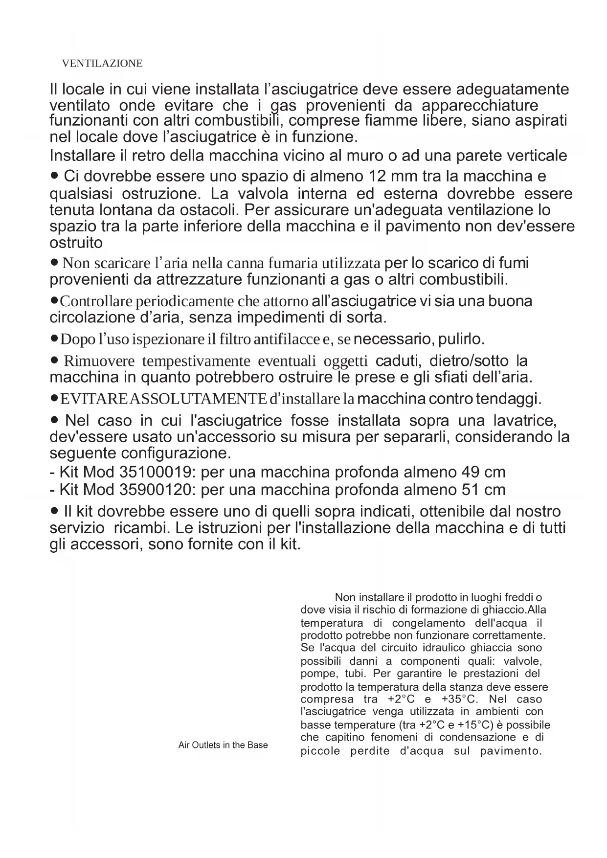 -Trockene Baumwolle, Eisen -Empfindliche Textilien Informationen für Test-Labor Bügeltrocken Bügeltrocken+Synthetisch Mangeltrocken Trommelinhalt 115 Maximales S. Energielabel Höhe 85 cm Breite 60 cm Tiefe 60 cm Energieeffizienzklasse S. Energielabel60 IT ● ATTENZIONE Non utilizzare il prodotto se il filtro antifilacce non è correttamente posizionato o risulta danneggiato; il filtro non è ignifugo. ●ATTENZIONE Se è esposto il simbolo indicante il riscaldamento della superficie ,quando l’asciugatrice è in funzione la temperatura può essere superiore a 60 gradi C. ● Staccare la spina dalla presa elettrica. Prima di pulire la macchina, staccare sempre la spina. ● Se si presume che la macchina sia guasta, non continuare ad usarla. ●Evitare che sul pavimento attorno alla macchina si raccolgano filacce e pelucchi. ● Dopo il ciclo di asciugatura, l’ interno del cestello può essere molto caldo. Prima di estrarre la biancheria è pertanto opportuno lasciar raffreddare completamente la macchina. ● L'ultima parte del ciclo di asciugatura viene fatta senza calore (ciclo freddo) per assicurare che i capi siano lasciati ad una temperatura che non li danneggi. ● L'asciugatrice non dev'essere usata se sono stati usati prodotti chimici per il lavaggio ●ATTENZIONE: mai fermare un' asciugatrice prima della fine del ciclo di asciugatura senza che tutti i capi siano rimossi velocemente e separati in modo che il calore si dissolva ● Massimo carico di asciugatura: vedere etichetta energetica. Installation ●Non utilizzare adattatori, connettori multipli e/o prolunghe. ● Non installare l’asciugatrice vicino ai tendaggi e rimuovere tempestivamente eventuali oggetti caduti dietro la macchina. ● L'apparecchio non deve essere installato dietro una porta che può essere chiusa a chiave, una porta scorrevole o una porta i cui cardini siano sul lato opposto rispetto a quelli dell'asciugatrice. Importante: durante il trasporto mantenere in posizione verticale l'asciugabiancheria. Se necessario ribaltarla esclusivamente nel lato indicato in figura. Attenzione: se il prodotto è stato ribaltato non correttamente prima di avviarlo attendere almeno 4 ore in modo tale che l'olio possa scorrere nuovamente nel compressore. In caso contrario il compressore può subire danni.0 EN6 Air Outlets in the Base Il locale in cui viene installata l’asciugatrice deve essere adeguatamente ventilato onde evitare che i gas provenienti da apparecchiature funzionanti con altri combustibili, comprese fiamme libere, siano aspirati nel locale dove l’asciugatrice è in funzione. Installare il retro della macchina vicino al muro o ad una parete verticale ● Ci dovrebbe essere uno spazio di almeno 12 mm tra la macchina e qualsiasi ostruzione. La valvola interna ed esterna dovrebbe essere tenuta lontana da ostacoli. Per assicurare un'adeguata ventilazione lo spazio tra la parte inferiore della macchina e il pavimento non dev'essere ostruito ● Non scaricare l’aria nella canna fumaria utilizzata per lo scarico di fumi provenienti da attrezzature funzionanti a gas o altri combustibili. ●Controllare periodicamente che attorno all’asciugatrice vi sia una buona circolazione d’aria, senza impedimenti di sorta. ● Dopo l’uso ispezionare il filtro antifilacce e, se necessario, pulirlo. ● Rimuovere tempestivamente eventuali oggetti caduti, dietro/sotto la macchina in quanto potrebbero ostruire le prese e gli sfiati dell’aria. ● EVITARE ASSOLUTAMENTE d’installare la macchina contro tendaggi. ● Nel caso in cui l'asciugatrice fosse installata sopra una lavatrice, dev'essere usato un'accessorio su misura per separarli, considerando la seguente configurazione. - Kit Mod 35100019: per una macchina profonda almeno 49 cm - Kit Mod 35900120: per una macchina profonda almeno 51 cm ● Il kit dovrebbe essere uno di quelli sopra indicati, ottenibile dal nostro servizio ricambi. Le istruzioni per l'installazione della macchina e di tutti gli accessori, sono fornite con il kit. VENTILAZIONE 62 IT Non installare il prodotto in luoghi freddi o dove visia il rischio di formazione di ghiaccio.Alla temperatura di congelamento dell'acqua il prodotto potrebbe non funzionare correttamente. Se l'acqua del circuito idraulico ghiaccia sono possibili danni a componenti quali: valvole, pompe, tubi. Per garantire le prestazioni del prodotto la temperatura della stanza deve essere compresa tra +2°C e +35°C. Nel caso l'asciugatrice venga utilizzata in ambienti con basse temperature (tra +2°C e +15°C) è possibile che capitino fenomeni di condensazione e di piccole perdite d'acqua sul pavimento.Tutela dell’ambiente Requisiti Elettrici 63 IT ● Tutti i materiali utilizzati per l’imballaggio sono ecologici e riciclabili. Smaltite l’imballaggio con metodi ecologici. Presso il comune di residenza si potranno reperire ulteriori informazioni sui metodi di smaltimento. ● Per garantire la sicurezza al momento dello smaltimento di una asciugatrice, scollegare la spina dell’alimentazione dalla presa, tagliare il cavo dell’alimentazione di rete e distruggerlo insieme alla spina. Per evitare che i bambini possano rimanere intrappolati all'interno della lavatrice, rompere i cardini o la chiusura dell’oblò. Servizio GIASAi fini della durata e del buon funzionamento della macchina, per gli eventuali interventi di assistenza o r ip a r a zi on e co n s i gl i a m o d i r iv ol g e r si esclusivamente al servizio assistenza autorizzato GIAS.Questo elettrodomestico è marcato conformemente alla Direttiva Europea 2 0 1 2 / 1 9 / E U s u i R i f i u t i d a Ap par ecc h ia t ur e El ett ric h e e d Elettroniche (RAEE). Direttiva Europea 2012/19/EU I RAEE contengono sia sostanze inquinanti (che possono cioè avere un impatto negativo anche molto pesante sull'ambiente) sia materie prime (che possono essere riutilizzate). E' perciò necessario sottoporre i RAEE ad apposite operazioni di trattamento, per rimuovere e smaltire 