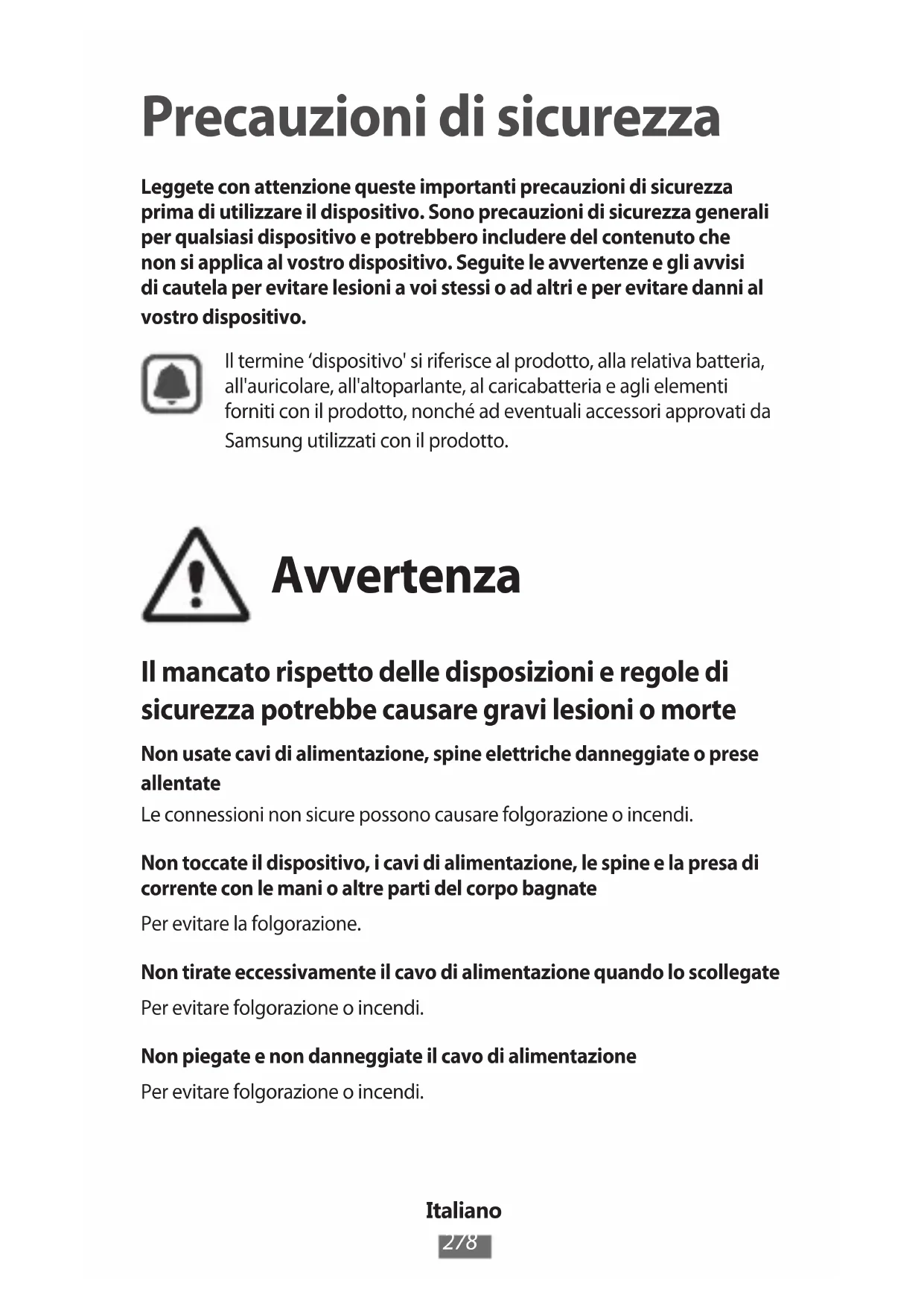 Precauzioni di sicurezza Leggete con attenzione queste importanti precauzioni di sicurezza prima di utilizzare il dispositivo. Sono precauzioni di sicurezza generali per qualsiasi dispositivo e potrebbero includere del contenuto che non si applica al vostro dispositivo. Seguite le avvertenze e gli avvisi di cautela per evitare lesioni a voi stessi o ad altri e per evitare danni al vostro dispositivo.Il termine ‘dispositivo' si riferisce al prodotto, alla relativa batteria, all'auricolare, all'altoparlante, al caricabatteria e agli elementi forniti con il prodotto, nonché ad eventuali accessori approvati da Samsung utilizzati con il prodotto. Avvertenza Il mancato rispetto delle disposizioni e regole di sicurezza potrebbe causare gravi lesioni o morte Non usate cavi di alimentazione, spine elettriche danneggiate o prese allentateLe connessioni non sicure possono causare folgorazione o incendi.Non toccate il dispositivo, i cavi di alimentazione, le spine e la presa di corrente con le mani o altre parti del corpo bagnatePer evitare la folgorazione.Non tirate eccessivamente il cavo di alimentazione quando lo scollegatePer evitare folgorazione o incendi.Non piegate e non danneggiate il cavo di alimentazionePer evitare folgorazione o incendi.Italiano