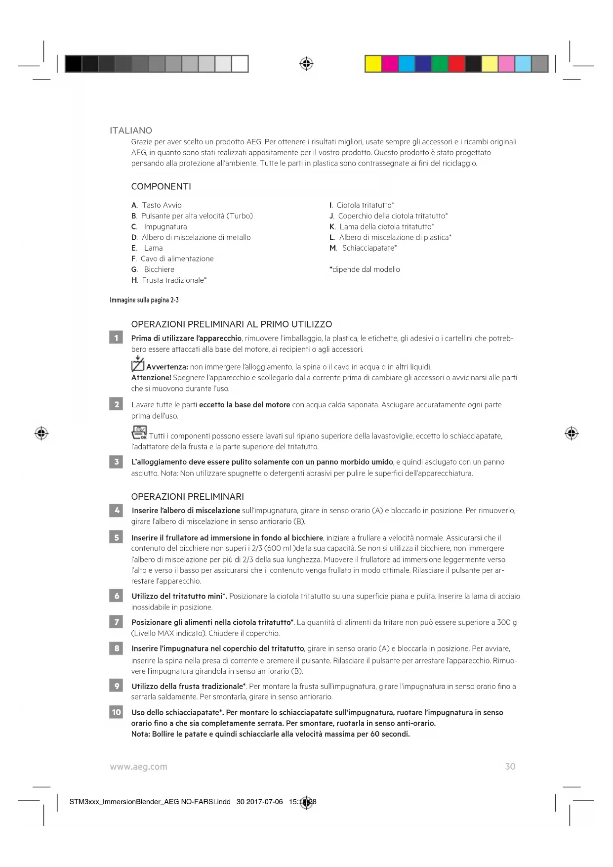 1 Prima di utilizzare l’apparecchio, rimuovere l’imballaggio, la plastica, le etichette, gli adesivi o i cartellini che potreb- bero essere attaccati alla base del motore, ai recipienti o agli accessori. Avvertenza: non immergere l’alloggiamento, la spina o il cavo in acqua o in altri liquidi. Attenzione! Spegnere l’apparecchio e scollegarlo dalla corrente prima di cambiare gli accessori o avvicinarsi alle parti che si muovono durante l’uso. 2 Lavare tutte le parti eccetto la base del motore con acqua calda saponata. Asciugare accuratamente ogni parte prima dell’uso. Tutti i componenti possono essere lavati sul ripiano superiore della lavastoviglie, eccetto lo schiacciapatate, l’adattatore della frusta e la parte superiore del tritatutto. 3 L’alloggiamento deve essere pulito solamente con un panno morbido umido, e quindi asciugato con un panno asciutto. Nota: Non utilizzare spugnette o detergenti abrasivi per pulire le superci dell’apparecchiatura. OPERAZIONI PRELIMINARI 4 Inserire l’albero di miscelazione sull’impugnatura, girare in senso orario (A) e bloccarlo in posizione. Per rimuoverlo, girare l’albero di miscelazione in senso antiorario (B). 5 Inserire il frullatore ad immersione in fondo al bicchiere, iniziare a frullare a velocità normale. Assicurarsi che il contenuto del bicchiere non superi i 2/3 (600 ml )della sua capacità. Se non si utilizza il bicchiere, non immergere l’albero di miscelazione per più di 2/3 della sua lunghezza. Muovere il frullatore ad immersione leggermente verso l’alto e verso il basso per assicurarsi che il contenuto venga frullato in modo ottimale. Rilasciare il pulsante per ar- restare l’apparecchio. 6 Utilizzo del tritatutto mini*. Posizionare la ciotola tritatutto su una supercie piana e pulita. Inserire la lama di acciaio inossidabile in posizione. 7 Posizionare gli alimenti nella ciotola tritatutto*. La quantità di alimenti da tritare non può essere superiore a 300 g (Livello MAX indicato). Chiudere il coperchio. 8 Inserire l’impugnatura nel coperchio del tritatutto, girare in senso orario (A) e bloccarla in posizione. Per avviare, inserire la spina nella presa di corrente e premere il pulsante. Rilasciare il pulsante per arrestare l’apparecchio. Rimuo- vere l’impugnatura girandola in senso antiorario (B). 9 Utilizzo della frusta tradizionale*. Per montare la frusta sull’impugnatura, girare l’impugnatura in senso orario no a serrarla saldamente. Per smontarla, girare in senso antiorario. 10 Uso dello schiacciapatate*. Per montare lo schiacciapatate sull’impugnatura, ruotare l’impugnatura in senso orario no a che sia completamente serrata. Per smontare, ruotarla in senso anti-orario. Nota: Bollire le patate e quindi schiacciarle alla velocità massima per 60 secondi. STM3xxx_ImmersionBlender_AEG NO-FARSI.indd 30 2017-07-06 15:18:2831 www.aeg.com