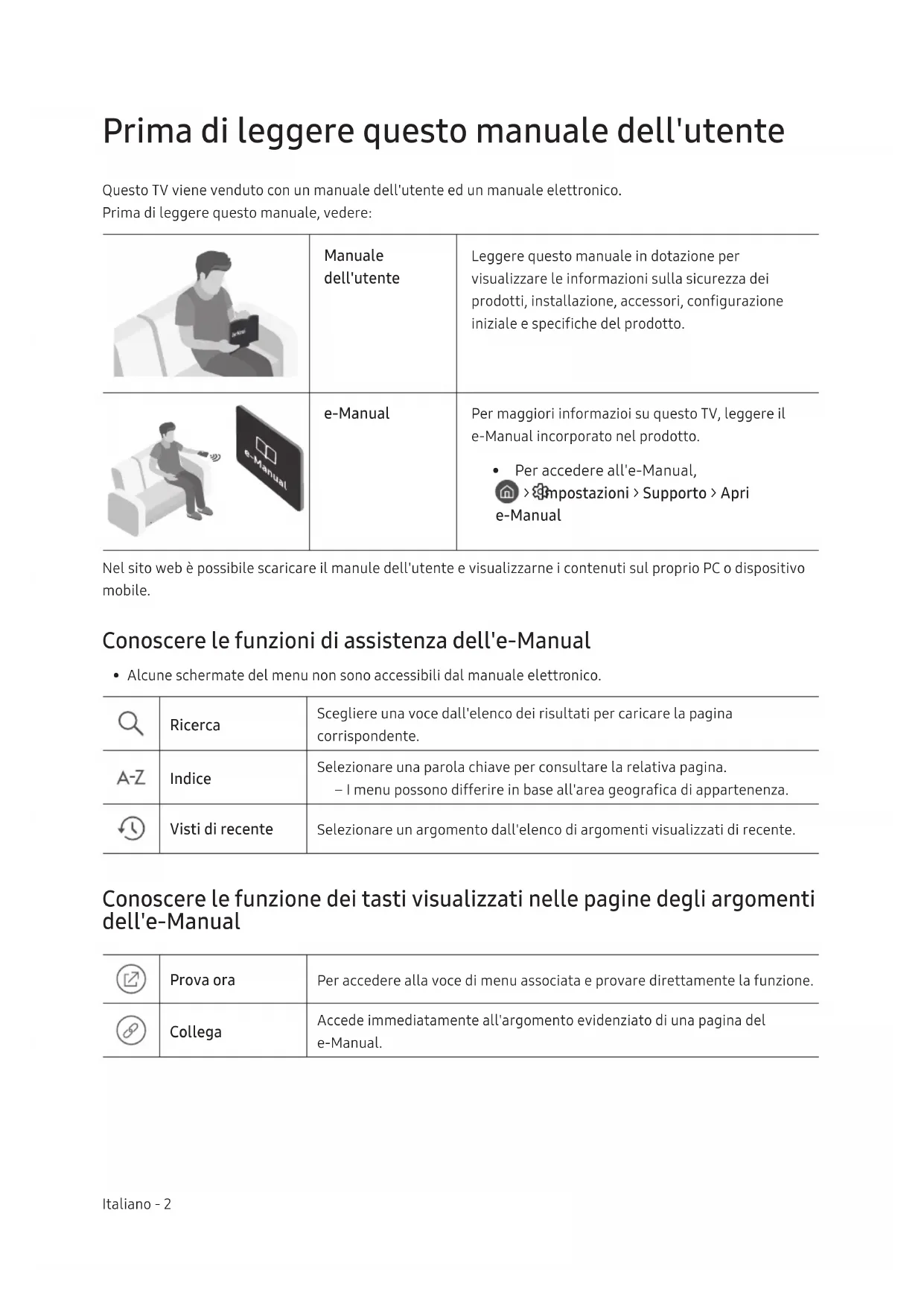 - Per accedere all'e-Manual, > Impostazioni > Supporto > Apri e-Manual Nel sito web è possibile scaricare il manule dell'utente e visualizzarne i contenuti sul proprio PC o dispositivo mobile. Conoscere le funzioni di assistenza dell'e-Manual