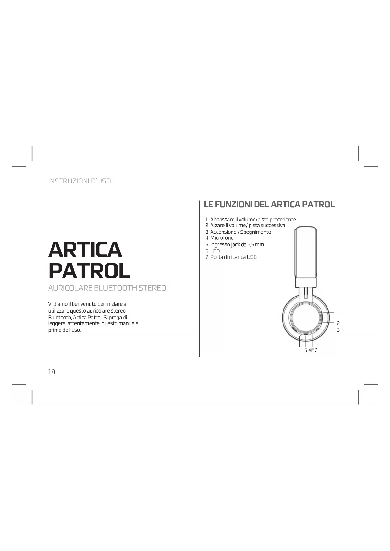 Abbassare il volume/pista precedente Alzare il volume/ pista successiva Accensione / Spegnimento Microfono Ingresso jack da 3,5 mm LED Porta di ricarica USB ARTICA PATROL