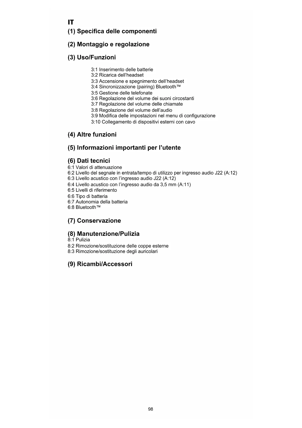 (1) Specica delle componenti (2) Montaggio e regolazione (3) Uso/Funzioni 3:1 Inserimento delle batterie 3:2 Ricarica dell’headset 3:3 Accensione e spegnimento dell’headset 3:4 Sincronizzazione (pairing) Bluetooth™ 3:5 Gestione delle telefonate 3:6 Regolazione del volume dei suoni circostanti 3:7 Regolazione del volume delle chiamate 3:8 Regolazione del volume dell’audio 3:9 Modica delle impostazioni nel menu di congurazione 3:10 Collegamento di dispositivi esterni con cavo (4) Altre funzioni (5) Informazioni importanti per l’utente (6) Dati tecnici 6:1 Valori di attenuazione 6:2 Livello del segnale in entrata/tempo di utilizzo per ingresso audio J22 (A:12) 6:3 Livello acustico con l’ingresso audio J22 (A:12) 6:4 Livello acustico con l’ingresso audio da 3,5 mm (A:11) 6:5 Livelli di riferimento 6:6 Tipo di batteria 6:7 Autonomia della batteria 6:8 Bluetooth™ (7) Conservazione (8) Manutenzione/Pulizia 8:1 Pulizia 8:2 Rimozione/sostituzione delle coppe esterne 8:3 Rimozione/sostituzione degli auricolari (9) Ricambi/Accessori98