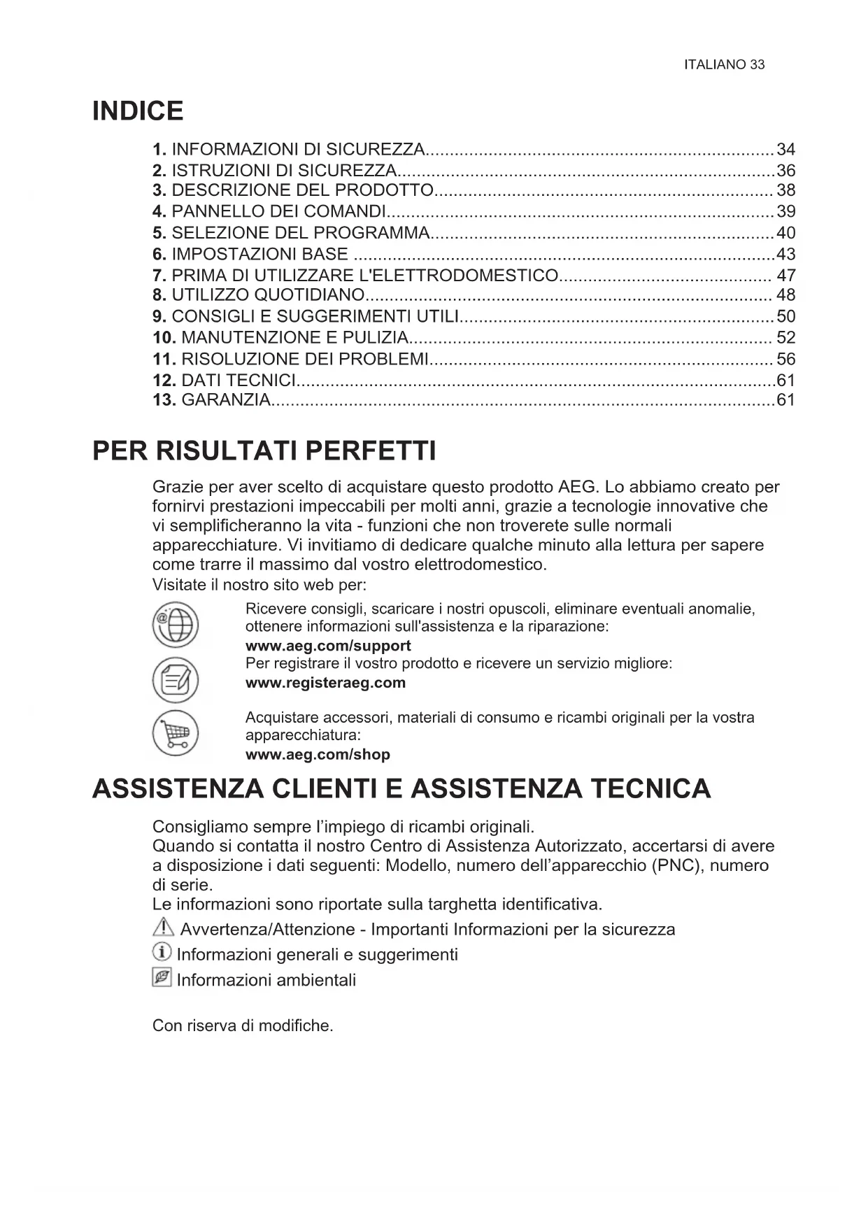 Consigliamo sempre l’impiego di ricambi originali. Quando si contatta il nostro Centro di Assistenza Autorizzato, accertarsi di avere a disposizione i dati seguenti: Modello, numero dell’apparecchio (PNC), numero di serie. Le informazioni sono riportate sulla targhetta identificativa. Avvertenza/Attenzione - Importanti Informazioni per la sicurezza Informazioni generali e suggerimenti Informazioni ambientali Con riserva di modifiche.