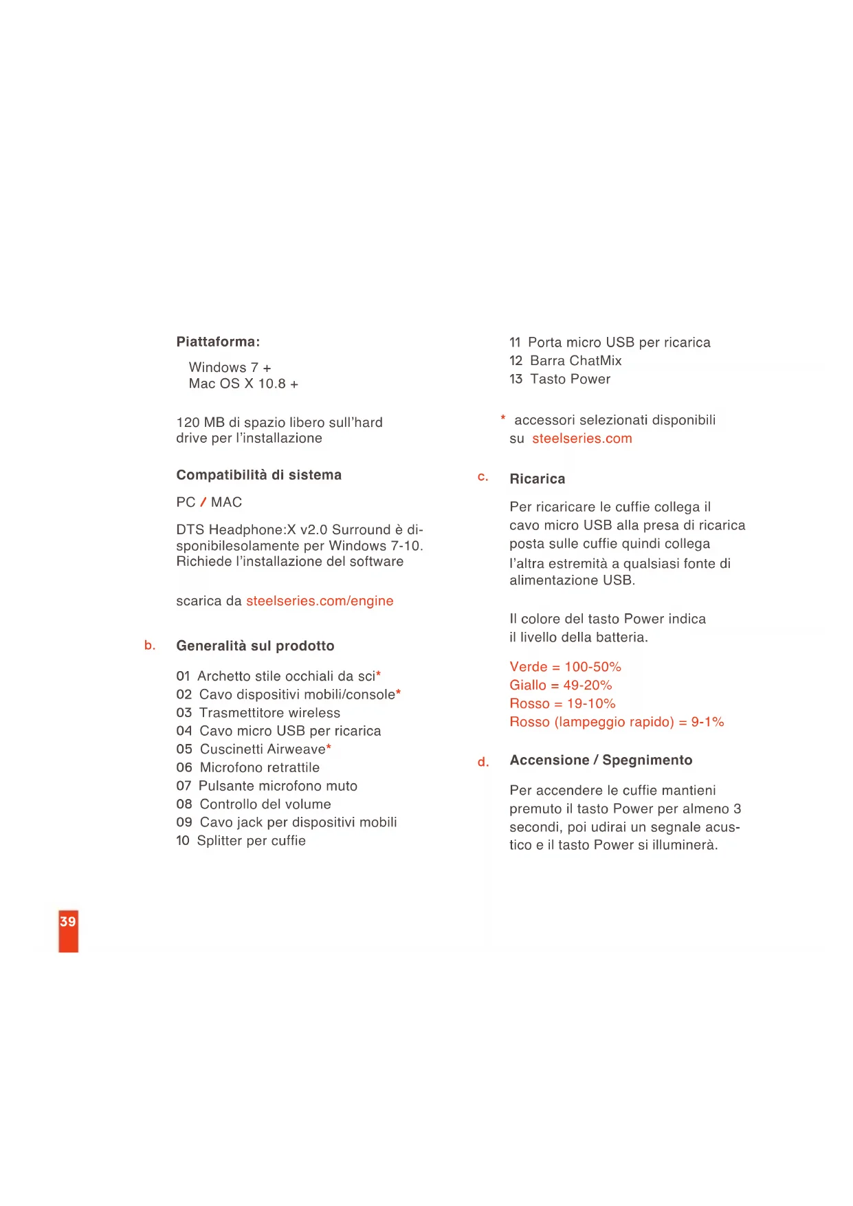 Contenuti della confezione Guida informazioni sul prodotto Cuffie Trasmettitore wireless Cavo dispositivi mobili/console Cavo micro USB per ricarica39 scarica da steelseries.com/engine 120 MB di spazio libero sull’hard drive per l’installazione Piattaforma: Windows 7 + Mac OS X 10.8 + Compatibilità di sistema PC / MAC DTS Headphone:X v2.0 Surround è di- sponibilesolamente per Windows 7-10. Richiede l’installazione del software