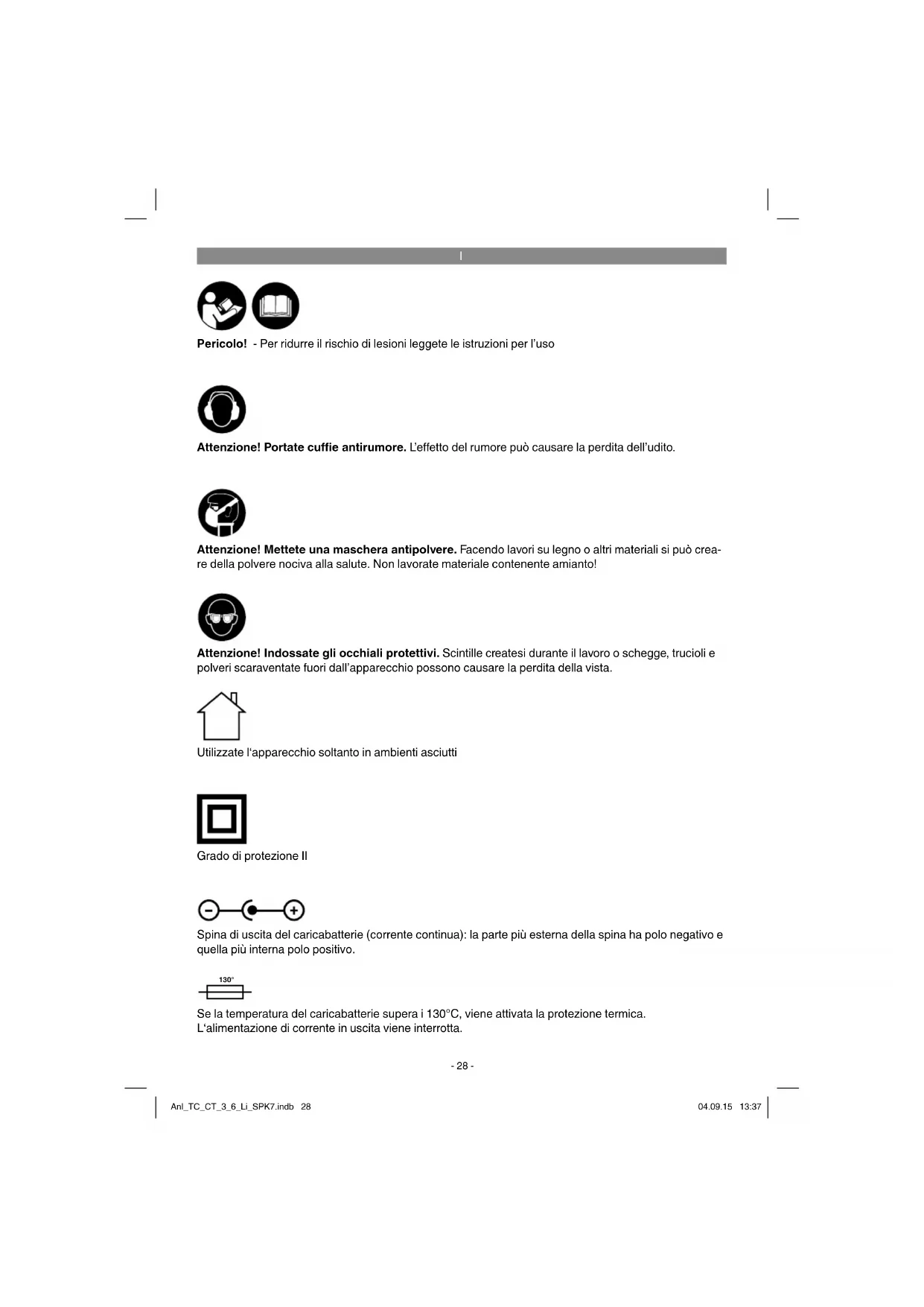 Pericolo! - Per ridurre il rischio di lesioni leggete le istruzioni per l’uso Attenzione! Portate cuffi e antirumore. L’e ff etto del rumore può causare la perdita dell’udito. Attenzione! Indossate gli occhiali protettivi. Scintille createsi durante il lavoro o schegge, trucioli e polveri scaraventate fuori dall’apparecchio possono causare la perdita della vista. Attenzione! Mettete una maschera antipolvere. Facendo lavori su legno o altri materiali si può crea- re della polvere nociva alla salute. Non lavorate materiale contenente amianto! Utilizzate l‘apparecchio soltanto in ambienti asciutti Grado di protezione II Spina di uscita del caricabatterie (corrente continua): la parte più esterna della spina ha polo negativo e quella più interna polo positivo. 130° Se la temperatura del caricabatterie supera i 130°C, viene attivata la protezione termica. L‘alimentazione di corrente in uscita viene interrotta. Anl_TC_CT_3_6_Li_SPK7.indb 28Anl_TC_CT_3_6_Li_SPK7.indb 28 04.09.15 13:3704.09.15 13:37I