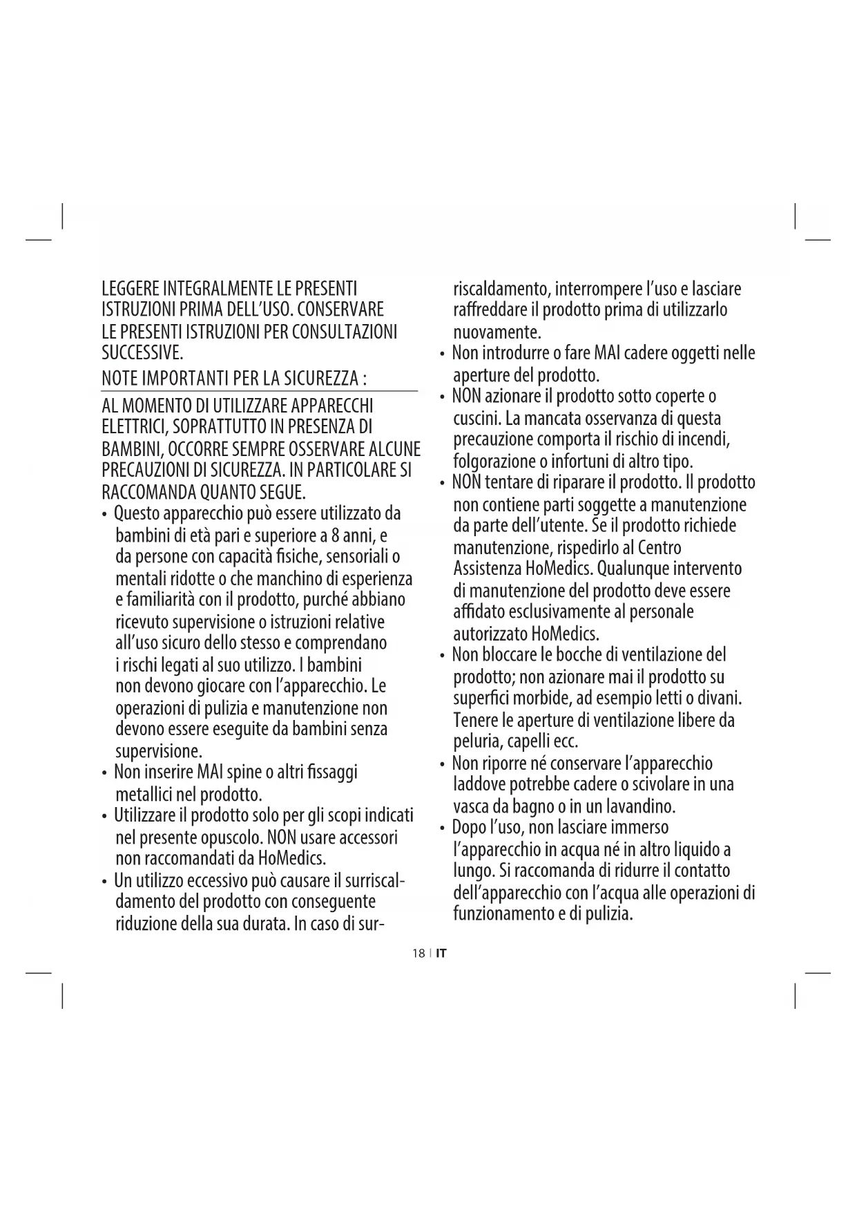 - Utilizzare il prodotto solo per gli scopi indicati nel presente opuscolo. NON usare accessori non raccomandati da HoMedics.