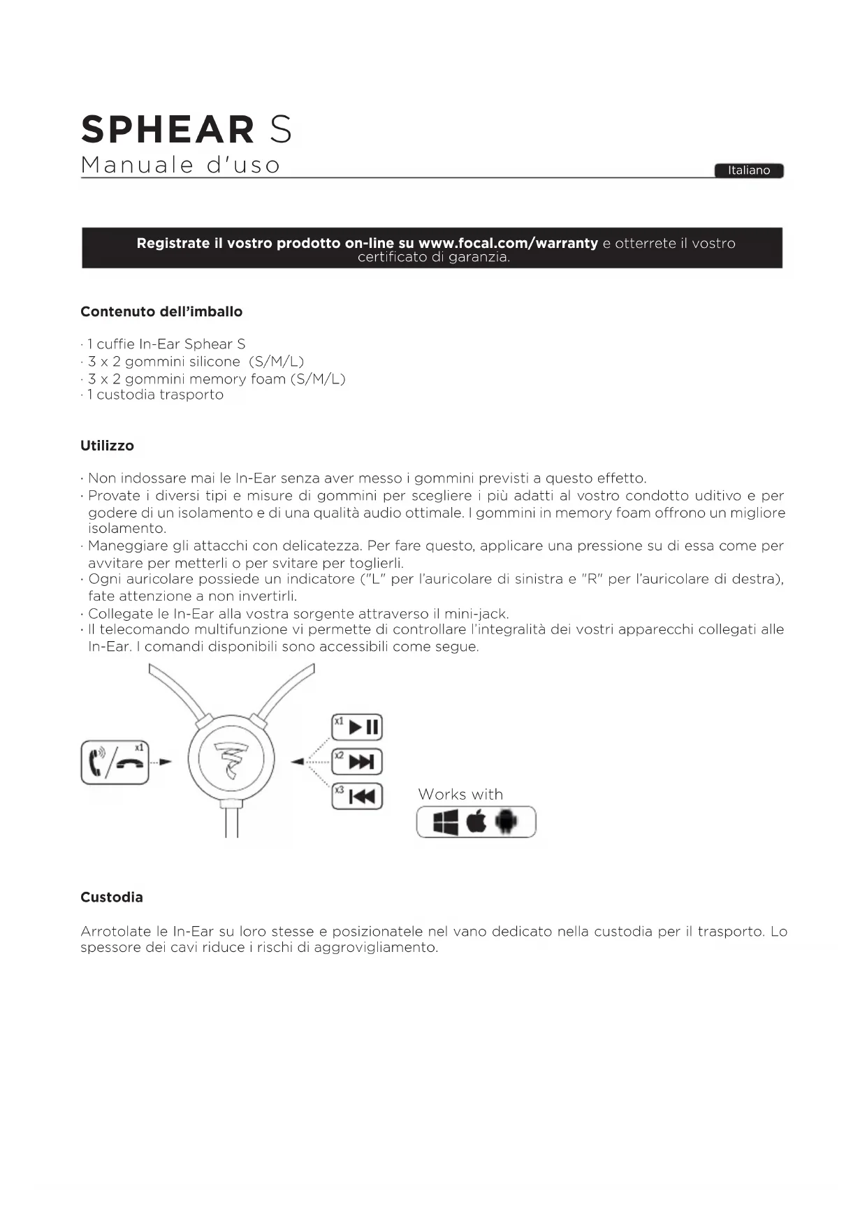Manuale d'uso Italiano Registrate il vostro prodotto on-line su www.focal.com/warranty e otterrete il vostro certificato di garanzia. Contenuto dell’imballo ∙ 1 cue In-Ear Sphear S ∙ 3 x 2 gommini silicone (S/M/L) ∙ 3 x 2 gommini memory foam (S/M/L) ∙ 1 custodia trasporto Utilizzo ∙ Non indossare mai le In-Ear senza aver messo i gommini previsti a questo eetto. ∙ Provate i diversi tipi e misure di gommini per scegliere i più adatti al vostro condotto uditivo e per godere di un isolamento e di una qualità audio ottimale. I gommini in memory foam orono un migliore isolamento. ∙ Maneggiare gli attacchi con delicatezza. Per fare questo, applicare una pressione su di essa come per avvitare per metterli o per svitare per toglierli. ∙ Ogni auricolare possiede un indicatore ("L" per l’auricolare di sinistra e "R" per l’auricolare di destra), fate attenzione a non invertirli. ∙ Collegate le In-Ear alla vostra sorgente attraverso il mini-jack. ∙ Il telecomando multifunzione vi permette di controllare l’integralità dei vostri apparecchi collegati alle In-Ear. I comandi disponibili sono accessibili come segue.