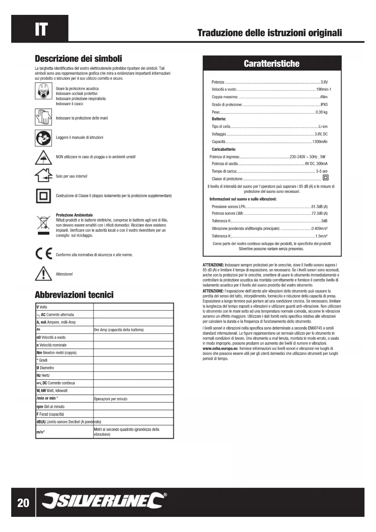 Caratteristiche Potenza: .................................................................................................. 3.6V Velocità a vuoto: ..................................................................................190min-1 Coppia massima: ....................................................................................4Nm Grado di protezione: ................................................................................ IPX0 Peso: .................................................................................................. 0,38 kg Batteria: Tipo di cella...........................................................................................Li-ion Voltaggio ........................................................................................... 3.6V, DC Capacità ..........................................................................................1300mAh Caricabatterie: Potenza di ingresso ....................................................230-240V ~ 50Hz , 5W Potenza di uscita .....................................................................6V DC, 300mA Tempo di carica: ................................................................................. 3-5 ore Classe di protezione ................................................................................. Il livello di intensità del suono per l'operatore può superare i 85 dB (A) e le misure di protezione del suono sono necessari. Informazioni sul suono e sulle vibrazioni: Pressione sonora LPA: ....................................................................61.3dB (A) Potenza sonora LWA: ......................................................................72.3dB (A) Tolleranza K:.............................................................................................3dB Vibrazione ponderata ah(Maniglia principale): ................................0.409m/s² Tolleranza K:.......................................................................................1.5m/s² Come parte del nostro continuo sviluppo dei prodotti, le specifiche dei prodotti Silverline possono variare senza preavviso. Descrizione dei simboli La targhetta identificativa del vostro elettroutensile potrebbe riportare dei simboli. Tali simboli sono una rappresentazione grafica che mira a evidenziare importanti informazioni sul prodotto o istruzioni per il suo utilizzo corretto e sicuro.Usare la protezione acustica Indossare occhiali protettivi Indossare protezione respiratoria Indossare il cascoIndossare la protezione delle maniLeggere il manuale di istruzioniNON utilizzare in caso di pioggia o in ambienti umidi!Solo per uso interno!Costruzione di Classe II (doppio isolamento per la protezione supplementare)Protezione Ambientale Rifiuti prodotti e le batterie elettriche, comprese le batterie agli ioni di litio, non devono essere smaltiti con i rifiuti domestici. Riciclare dove esistono impianti. Verificare con le autorità locali o con il vostro rivenditore per un consiglio sul riciclaggio.Conforme alla normativa di sicurezza e alle norme.Attenzione!ATTENZIONE: Indossare sempre protezioni per le orecchie, dove il livello sonoro supera i 85 dB (A) e limitare il tempo di esposizione, se necessario. Se i livelli sonori sono scomodi, anche con la protezioni per le orecchie, smettere di usare lo strumento immediatamente e controllare la protezione acustica sia montata correttamente e fornisce il corretto livello di isolamento acustico per il livello del suono prodotto dal vostro strumento. ATTENZIONE: l'esposizione dell'utente alle vibrazioni dello strumento può causare la perdita del senso del tatto, intorpidimento, formicolio e riduzione della capacità di presa. Esposizione a lungo termine può portare ad una condizione cronica. Se necessario, limitare la lunghezza del tempo esposti a vibrazioni e utilizzare guanti anti-vibrazione. Non utilizzare lo strumento con le mani sotto ad una temperatura normale comoda, siccome le vibrazioni avranno un effetto maggiore. Utilizzare i dati forniti nella specifica relativa alle vibrazioni per calcolare la durata e la frequenza di funzionamento dello strumento.I livelli sonori e vibrazioni nella specifica sono determinate a secondo EN60745 o simili standard internazionali. Le figure rappresentano un normale utilizzo per lo strumento in normali condizioni di lavoro. Uno strumento a mal tenuta, montata in modo errato, o usato in modo improprio, possono produrre un aumento dei livelli di rumore e vibrazioni. www.osha.europa.eu fornisce informazioni sui livelli sonori e vibrazioni nei luoghi di lavoro che possono essere utili per gli utenti domestici che utilizzano strumenti per lunghi periodi di tempo. Traduzione delle istruzioni originali T-130˚ V Volts~, AC Corrente alternataA, mA Ampere, milli-Amp Ore Amp (capacità della batteria)n0 Velocità a vuoton Velocità nominaleNm Newton metri (coppia)° GradiØ DiametroHz Hertz, DC Corrente continuaW, kW Watt, kilowatt/min or min Operazioni per minutorpm Giri al minutoF Farad (capacità)dB(A) Livello sonoro Decibel (A ponderato) m/s