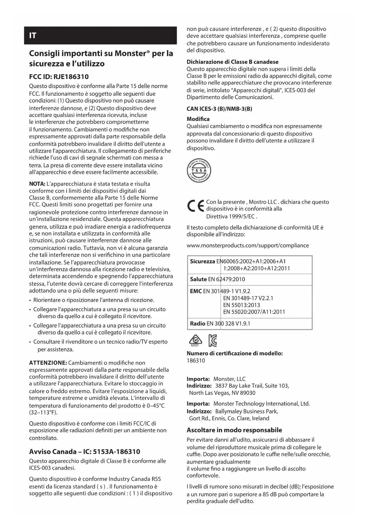 - Consultare il rivenditore o un tecnico radio/TV esperto per assistenza. ATTENZIONE: Cambiamenti o modiche non espressamente approvati dalla parte responsabile della conformità potrebbero invalidare il diritto dell’utente a utilizzare l’apparecchiatura. Evitare lo stoccaggio in calore o freddo estremo. Evitare l’esposizione a liquidi, temperature estreme e umidità elevata. L’intervallo di temperatura di funzionamento del prodotto è 0–45°C (32–113°F). Questo dispositivo è conforme con i limiti FCC/IC di esposizione alle radiazioni deniti per un ambiente non controllato. Avviso Canada – IC: 5153A-186310 Questo apparecchio digitale di Classe B è conforme alle ICES-003 canadesi. Questo dispositivo è conforme Industry Canada RSS esenti da licenza standard ( s ) . Il funzionamento è soggetto alle seguenti due condizioni : ( 1 ) il dispositivo non può causare interferenze , e ( 2) questo dispositivo deve accettare qualsiasi interferenza , comprese quelle che potrebbero causare un funzionamento indesiderato del dispositivo. Dichiarazione di Classe B canadese Questo apparecchio digitale non supera i limiti della Classe B per le emissioni radio da apparecchi digitali, come stabilito nelle apparecchiature che provocano interferenze di serie, intitolato “Apparecchi digitali”, ICES-003 del Dipartimento delle Comunicazioni. CAN ICES-3 (B)/NMB-3(B) Modica Qualsiasi cambiamento o modica non espressamente approvata dal concessionario di questo dispositivo possono invalidare il diritto dell’utente a utilizzare il dispositivo. Con la presente , Mostro LLC . dichiara che questo dispositivo è in conformità alla Direttiva 1999/5/EC . Il testo completo della dichiarazione di conformità UE è disponibile all’indirizzo: www.monsterproducts.com/support/compliance Sicurezza EN60065:2002+A1:2006+A1 1:2008+A2:2010+A12:2011 Salute EN 62479:2010