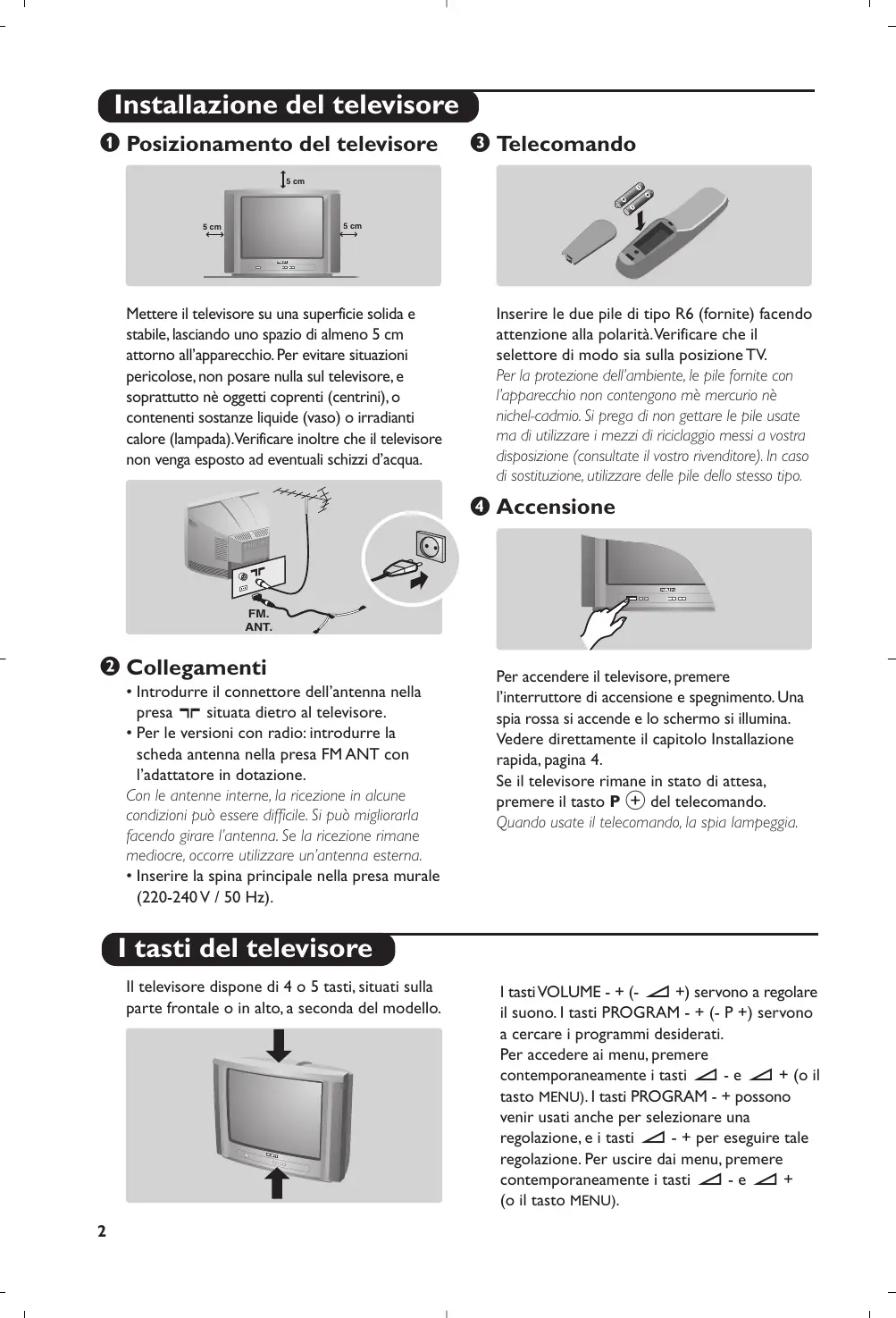 Italiano La ringraziamo per aver acquistato questo televisore. Il presente manualetto è stato concepito per aiutarla ad installare e utilizzare il suo televisore. Le consigliamo vivamente di leggerlo fino in fondo. Ci auguriamo che la nostra tecnologia la soddisfi pienamente. Dichiarazione di conformità Si dichiara che l’apparecchio televisore a colori (vedere indicazioni sull’etichetta applicata nell’ultima pagina di copertina) risponde alle prescrizioni dell’art.2 comma 1 del D.M. 28 Agosto 1995 n. 548. Fatto a Dreux, il Febbraio 2004 P. E.G.P. 1, rue de Réveillon 28104 Dreux France Installazione del televisore & Posizionamento del televisore “ Telecomando 5 cm 5 cm 5 cm Mettere il televisore su una superficie solida e stabile, lasciando uno spazio di almeno 5 cm attorno all’apparecchio. Per evitare situazioni pericolose, non posare nulla sul televisore, e soprattutto nè oggetti coprenti (centrini), o contenenti sostanze liquide (vaso) o irradianti calore (lampada).Verificare inoltre che il televisore non venga esposto ad eventuali schizzi d’acqua. Inserire le due pile di tipo R6 (fornite) facendo attenzione alla polarità.Verificare che il selettore di modo sia sulla posizione TV. Per la protezione dell’ambiente, le pile fornite con l’apparecchio non contengono mè mercurio nè nichel-cadmio. Si prega di non gettare le pile usate ma di utilizzare i mezzi di riciclaggio messi a vostra disposizione (consultate il vostro rivenditore). In caso di sostituzione, utilizzare delle pile dello stesso tipo. ‘ Accensione FM. ANT. é Collegamenti
