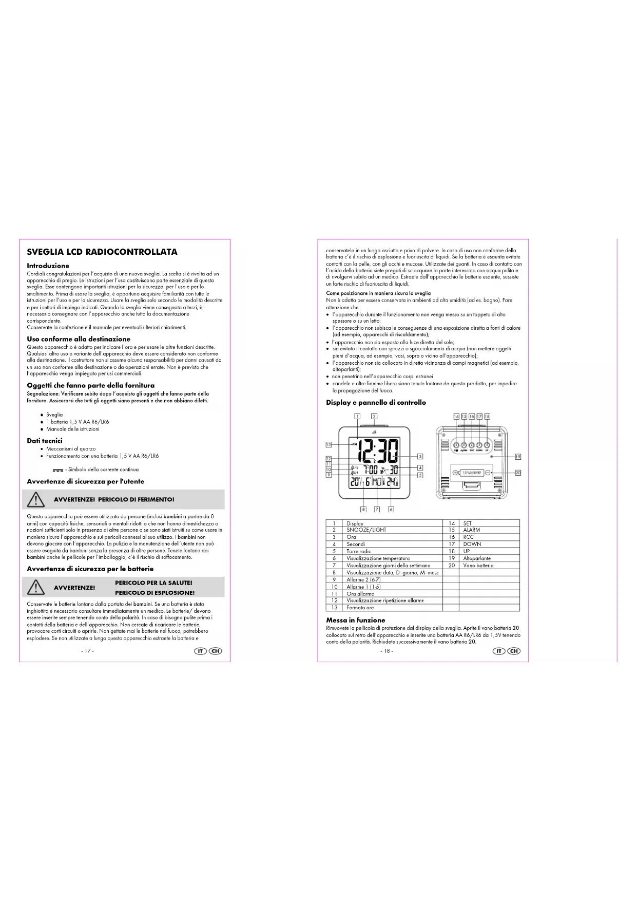 Messa in funzione Rimuovete la pellicola di protezione dal display della sveglia. Aprite il vano batteria 20 collocato sul retro dell’apparecchio e inserite una batteria AA R6/LR6 da 1,5V tenendo conto della polarità. Richiudete successivamente il vano batteria 20.- 19 - Una volta inserita la batteria il segnale radio viene ricevuto automaticamente. Sentirete a questo punto un segnale. La torre radio 5 lampeggia nel display. Questo procedimento può richiedere dai 3 ai 10 minuti. Avvertenza: Siete pregati di non muovere la sveglia durante il tentativo di ricezione. Avvertenza: Siete pregati di non muovere la sveglia durante il tentativo di ricezione.Avvertenza: Siete pregati di non muovere la sveglia durante il tentativo di ricezione. Avvertenza: Siete pregati di non muovere la sveglia durante il tentativo di ricezione.