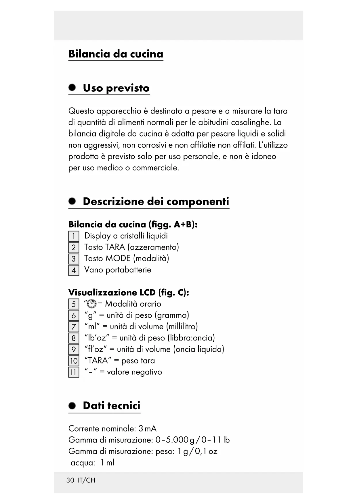 “–” = valore negativo Dati tecnici Corrente nominale: 3 mA Gamma di misurazione: 0–5.000 g / 0–11 lb Gamma di misurazione: peso: 1 g / 0,1 oz acqua: 1 ml31 IT/CH Batterie: 2 batterie da 1,5 V , tipo AAA Volume di consegna 1 bilancia digitale da cucina 2 batterie da 1,5 V tipo AAA 1 istruzioni d’uso Misure di sicurezza CoNSERvARE LE INDICAZIoNI DI SICUREZZA E LE ISTRUZIoNI pER EvENTUALI NECESSITà FUTURE! Indicazioni generali di sicurezza PERICO-