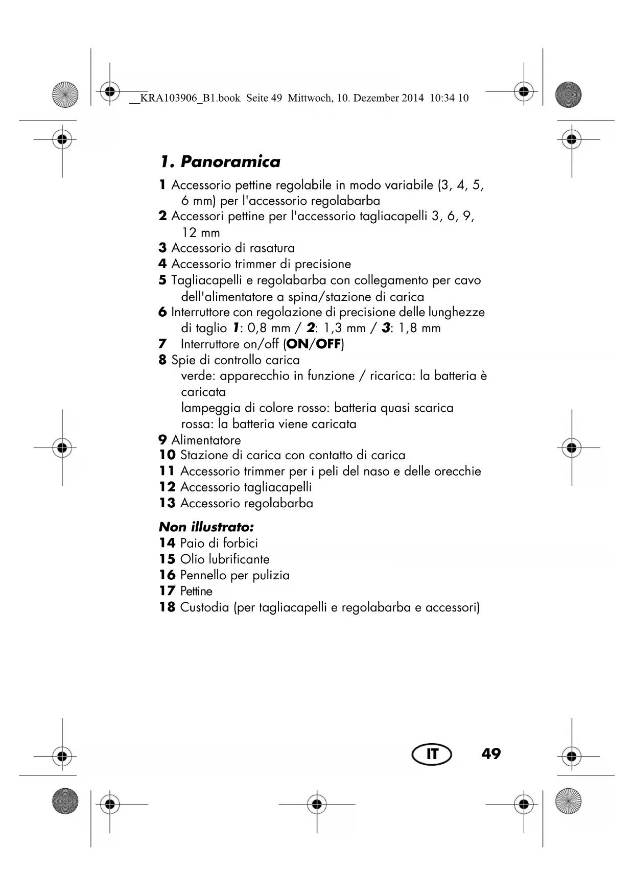1 Accessorio pettine regolabile in modo variabile (3, 4, 5, 6 mm) per l'accessorio regolabarba 2 Accessori pettine per l'accessorio tagliacapelli 3, 6, 9, 12 mm 3 Accessorio di rasatura 4 Accessorio trimmer di precisione 5 Tagliacapelli e regolabarba con collegamento per cavo dell'alimentatore a spina/stazione di carica 6 Interruttore con regolazione di precisione delle lunghezze di taglio 1: 0,8 mm / 2: 1,3 mm / 3:1,8mm 7 Interruttore on/off (ON/OFF) 8 Spie di controllo carica verde: apparecchio in funzione / ricarica: la batteria è caricata lampeggia di colore rosso: batteria quasi scarica rossa: la batteria viene caricata 9 Alimentatore 10 Stazione di carica con contatto di carica 11 Accessorio trimmer per i peli del naso e delle orecchie 12 Accessorio tagliacapelli 13 Accessorio regolabarba Non illustrato: 14 Paio di forbici 15 Olio lubrificante 16 Pennello per pulizia 17 Pettine 18 Custodia (per tagliacapelli e regolabarba e accessori)