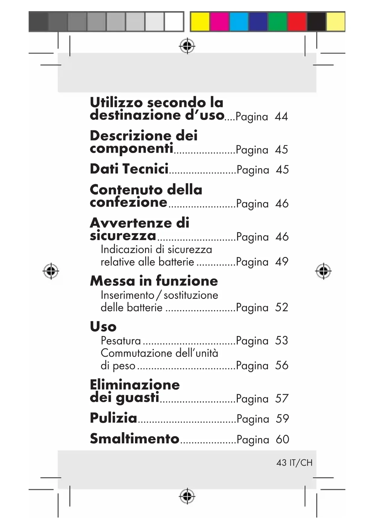 Utilizzo secondo la destinazione d’uso ....Pagina 44 Descrizione dei componenti ......................Pagina 45 Dati Tecnici ........................Pagina 45 Contenuto della confezione ........................Pagina 46 Avvertenze di sicurezza ............................Pagina 46 Indicazioni di sicurezza relative alle batterie ..............Pagina 49 Messa in funzione Inserimento / sostituzione delle batterie .........................Pagina 52 Uso Pesatura .................................Pagina 53 Commutazione dell’unità di peso ...................................Pagina 56 Eliminazione dei guasti ...........................Pagina 57 Pulizia ...................................Pagina 59 Smaltimento ....................Pagina 6044 IT/CH Bilancia digitale per valigia Utilizzo secondo la destinazione d’uso Questo apparecchio è destinato alla pesatura di bagagli. Esso non è destinato alla pesatura di prodotti medicinali o materiali non ammessi. Qualsiasi altro impiego o modifica del prodotto non è ammesso, in quanto potrebbe causare danni allo stesso. Potrebbero inoltre con- seguirne pericoli per l‘incolumità fisica, con esito anche mortale. Il prodotto è destinato esclusivamente all’uso privato. Il prodotto non è adatto all’impiego commerciale.45 IT/CH Descrizione dei componenti