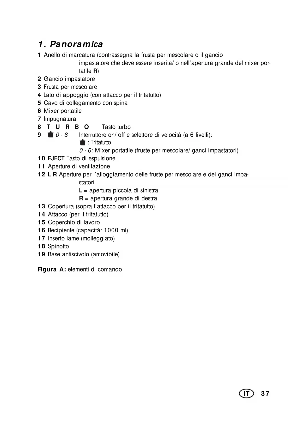 10 EJECT Tasto di espulsione 11 Aperture di ventilazione 12 L R Aperture per l’alloggiamento delle fruste per mescolare e dei ganci impa- statori L = apertura piccola di sinistra R = apertura grande di destra 13 Copertura (sopra l’attacco per il tritatutto) 14 Attacco (per il tritatutto) 15 Coperchio di lavoro 16 Recipiente (capacità: 1000 ml) 17 Inserto lame (molleggiato) 18 Spinotto 19 Base antiscivolo (amovibile) Figura A: elementi di comando38