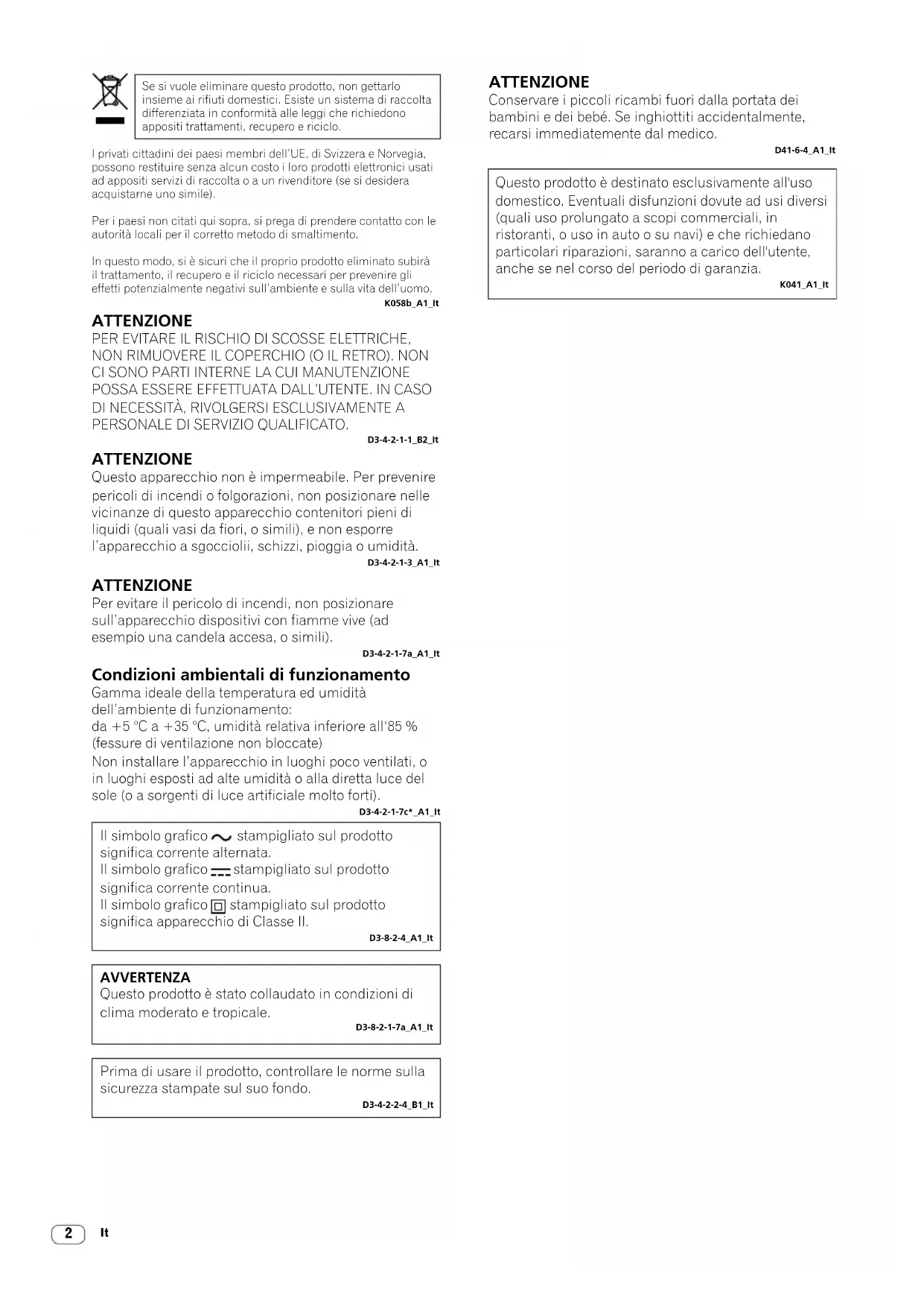 PERSONALE DI SERVIZIO QUALIFICATO. D3-4-2-1-1_B2_It ATTENZIONE Questo apparecchio non è impermeabile. Per prevenire pericoli di incendi o folgorazioni, non posizionare nelle vicinanze di questo apparecchio contenitori pieni di liquidi (quali vasi da fiori, o simili), e non esporre l’apparecchio a sgocciolii, schizzi, pioggia o umidità. D3-4-2-1-3_A1_It ATTENZIONE Per evitare il pericolo di incendi, non posizionare sull’apparecchio dispositivi con fiamme vive (ad esempio una candela accesa, o simili). D3-4-2-1-7a_A1_It Condizioni ambientali di funzionamento Gamma ideale della temperatura ed umidità dell’ambiente di funzionamento: da +5 °C a +35 °C, umidità relativa inferiore all‘85 % (fessure di ventilazione non bloccate) Non installare l’apparecchio in luoghi poco ventilati, o in luoghi esposti ad alte umidità o alla diretta luce del sole (o a sorgenti di luce artificiale molto forti). D3-4-2-1-7c*_A1_It Prima di usare il prodotto, controllare le norme sulla sicurezza stampate sul suo fondo. D3-4-2-2-4_B1_It ATTENZIONE Conservare i piccoli ricambi fuori dalla portata dei bambini e dei bebé. Se inghiottiti accidentalmente, recarsi immediatemente dal medico. D41-6-4_A1_It Questo prodotto è destinato esclusivamente all'uso domestico. Eventuali disfunzioni dovute ad usi diversi (quali uso prolungato a scopi commerciali, in ristoranti, o uso in auto o su navi) e che richiedano particolari riparazioni, saranno a carico dell'utente, anche se nel corso del periodo di garanzia. K041_A1_It Il simbolo grafico stampigliato sul prodotto significa corrente alternata. Il simbolo grafico stampigliato sul prodotto significa corrente continua. Il simbolo grafico stampigliato sul prodotto significa apparecchio di Classe II. D3-8-2-4_A1_It AVVERTENZA Questo prodotto è stato collaudato in condizioni di clima moderato e tropicale. D3-8-2-1-7a_A1_It3
