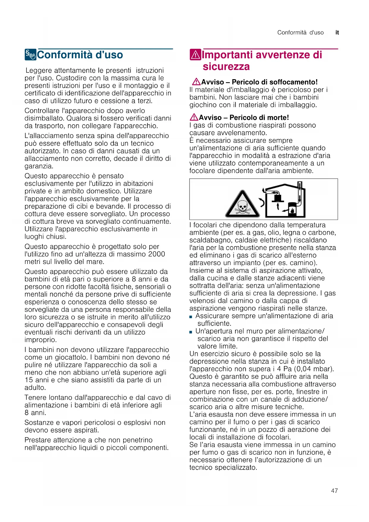 8Conformità d'uso Conf or mità d' us o Leggere attentamente le presenti istruzioni per l'uso. Custodire con la massima cura le presenti istruzioni per l'uso e il montaggio e il certificato di identificazione dell'apparecchio in caso di utilizzo futuro e cessione a terzi. Controllare l'apparecchio dopo averlo disimballato. Qualora si fossero verificati danni da trasporto, non collegare l'apparecchio. L'allacciamento senza spina dell'apparecchio può essere effettuato solo da un tecnico autorizzato. In caso di danni causati da un allacciamento non corretto, decade il diritto di garanzia. Questo apparecchio è pensato esclusivamente per l'utilizzo in abitazioni private e in ambito domestico. Utilizzare l'apparecchio esclusivamente per la preparazione di cibi e bevande. Il processo di cottura deve essere sorvegliato. Un processo di cottura breve va sorvegliato continuamente. Utilizzare l'apparecchio esclusivamente in luoghi chiusi. Questo apparecchio è progettato solo per l'utilizzo fino ad un'altezza di massimo 2000 metri sul livello del mare. Questo apparecchio può essere utilizzato da bambini di età pari o superiore a 8 anni e da persone con ridotte facoltà fisiche, sensoriali o mentali nonché da persone prive di sufficiente esperienza o conoscenza dello stesso se sorvegliate da una persona responsabile della loro sicurezza o se istruite in merito all'utilizzo sicuro dell'apparecchio e consapevoli degli eventuali rischi derivanti da un utilizzo improprio. I bambini non devono utilizzare l'apparecchio come un giocattolo. I bambini non devono né pulire né utilizzare l'apparecchio da soli a meno che non abbiano un'età superiore agli 15 anni e che siano assistiti da parte di un adulto. Tenere lontano dall'apparecchio e dal cavo di alimentazione i bambini di età inferiore agli 8 anni. Sostanze e vapori pericolosi o esplosivi non devono essere aspirati. Prestare attenzione a che non penetrino nell'apparecchio liquidi o piccoli componenti. (Importanti avvertenze di sicurezza Impor t ant i avv er t enze di si cur ezza :Avviso – Pericolo di soffocamento! Il materiale d'imballaggio è pericoloso per i bambini. Non lasciare mai che i bambini giochino con il materiale di imballaggio. :Avviso – Pericolo di morte! I gas di combustione riaspirati possono causare avvelenamento. È necessario assicurare sempre un'alimentazione di aria sufficiente quando l'apparecchio in modalità a estrazione d'aria viene utilizzato contemporaneamente a un focolare dipendente dall'aria ambiente. I focolari che dipendono dalla temperatura ambiente (per es. a gas, olio, legna o carbone, scaldabagno, caldaie elettriche) riscaldano l'aria per la combustione presente nella stanza ed eliminano i gas di scarico all'esterno attraverso un impianto (per es. camino). Insieme al sistema di aspirazione attivato, dalla cucina e dalle stanze adiacenti viene sottratta dell'aria: senza un'alimentazione sufficiente di aria si crea la depressione. I gas velenosi dal camino o dalla cappa di aspirazione vengono riaspirati nelle stanze. ■ Assicurare sempre un'alimentazione di aria sufficiente. ■ Un'apertura nel muro per alimentazione/ scarico aria non garantisce il rispetto del valore limite. Un esercizio sicuro è possibile solo se la depressione nella stanza in cui è installato l'apparecchio non supera i 4 Pa (0,04 mbar). Questo è garantito se può affluire aria nella stanza necessaria alla combustione attraverso aperture non fisse, per es. porte, finestre in combinazione con un canale di adduzione/ scarico aria o altre misure tecniche. L’aria esausta non deve essere immessa in un camino per il fumo o per i gas di scarico funzionante, né in un pozzo di aerazione dei locali di installazione di focolari. Se l’aria esausta viene immessa in un camino per fumo o gas di scarico non in funzione, è necessario ottenere l’autorizzazione di un tecnico specializzato.it Importanti avvertenze di sicurezza