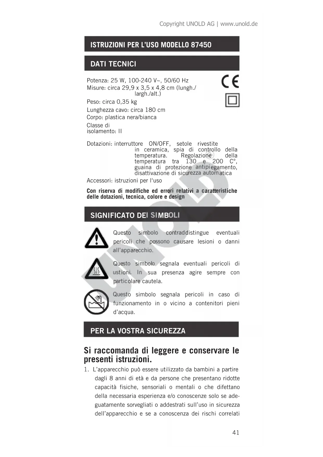 dagli 8 anni di età e da persone che presentano ridotte capacità fisiche, sensoriali o mentali o che difettano della necessaria esperienza e/o conoscenze solo se ade- guatamente sorvegliati o addestrati sull’uso in sicurezza dell’apparecchio e se a conoscenza dei rischi correlati Questo simbolo contraddistingue eventuali pericoli che possono causare lesioni o danni all’apparecchio. Questo simbolo segnala eventuali pericoli di ustioni. In sua presenza agire sempre con particolare cautela. Questo simbolo segnala pericoli in caso di funzionamento in o vicino a contenitori pieni d’acqua. Potenza: 25 W, 100-240 V~, 50/60 Hz Misure: circa 29,9 x 3,5 x 4,8 cm (lungh./ largh./alt.) Peso: circa 0,35 kg Lunghezza cavo: circa 180 cm Corpo: plastica nera/bianca Classe di isolamento: II Dotazioni: interruttore ON/OFF, setole rivestite in ceramica, spia di controllo della temperatura. Regolazione della temperatura tra 130 e 200 C°, guaina di protezione antipiegamento, disattivazione di sicurezza automatica Accessori: istruzioni per l‘uso Con riserva di modifiche ed errori relativi a caratteristiche delle dotazioni, tecnica, colore e design Copyright UNOLD AG | www.unold.de42 all’impiego dello stesso. L’apparecchio non è un giocat- tolo. La pulizia e la manutenzione dell’apparecchio pos- sono essere effettuate da bambini soltanto sotto sorve- glianza.