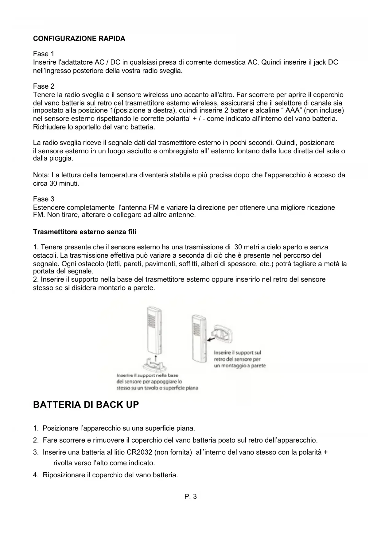 Se l'alimentazione AC viene interrotta, il display si spegne e sia la radio che l'allarme non funzioneranno. La batteria di backup manterrà l'ora e tutte le impostazioni del vostro aparecchio. Assicurarsi che venga utilizzata una batteria al litio CR2032 nuova. Una batteria nuova CR2032 può eseguire il backup dell'ora in continuazione per circa 3 giorni.