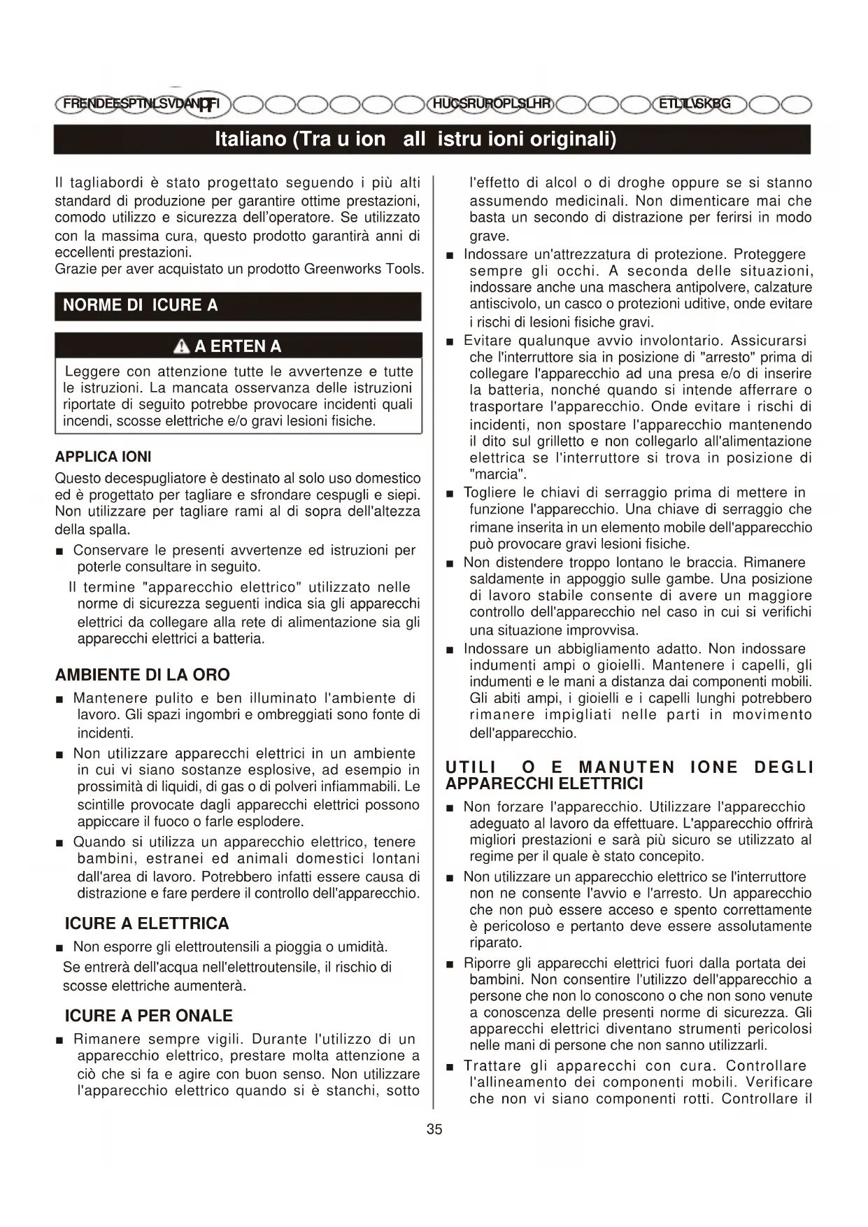 FR EN DE ES PT NL SV DA NO FI HU CS RU RO PL SL HR HU CS RU RO PL SL HR ET LT LV SK BG ET LT LV SK BG Il tagliabordi è stato progettato seguendo i più alti standard di produzione per garantire ottime prestazioni, comodo utilizzo e sicurezza dell’operatore. Se utilizzato con la massima cura, questo prodotto garantirà anni di eccellenti prestazioni. Grazie per aver acquistato un prodotto Greenworks Tools.
