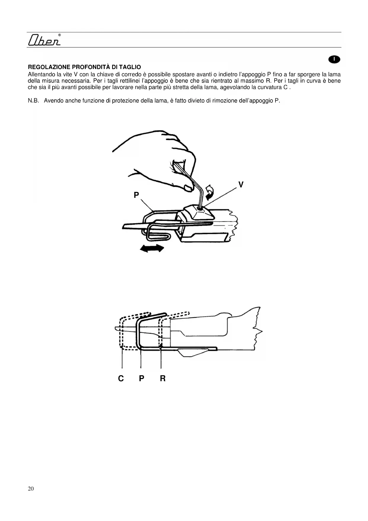Allentando la vite V con la chiave di corredo è possibile spostare avanti o indietro l’appoggio P fino a far sporgere la lama della misura necessaria. Per i tagli rettilinei l’appoggio è bene che sia rientrato al massimo R. Per i tagli in curva è bene che sia il più avanti possibile per lavorare nella parte più stretta della lama, agevolando la curvatura C . N.B. Avendo anche funzione di protezione della lama, è fatto divieto di rimozione dell’appoggio P.