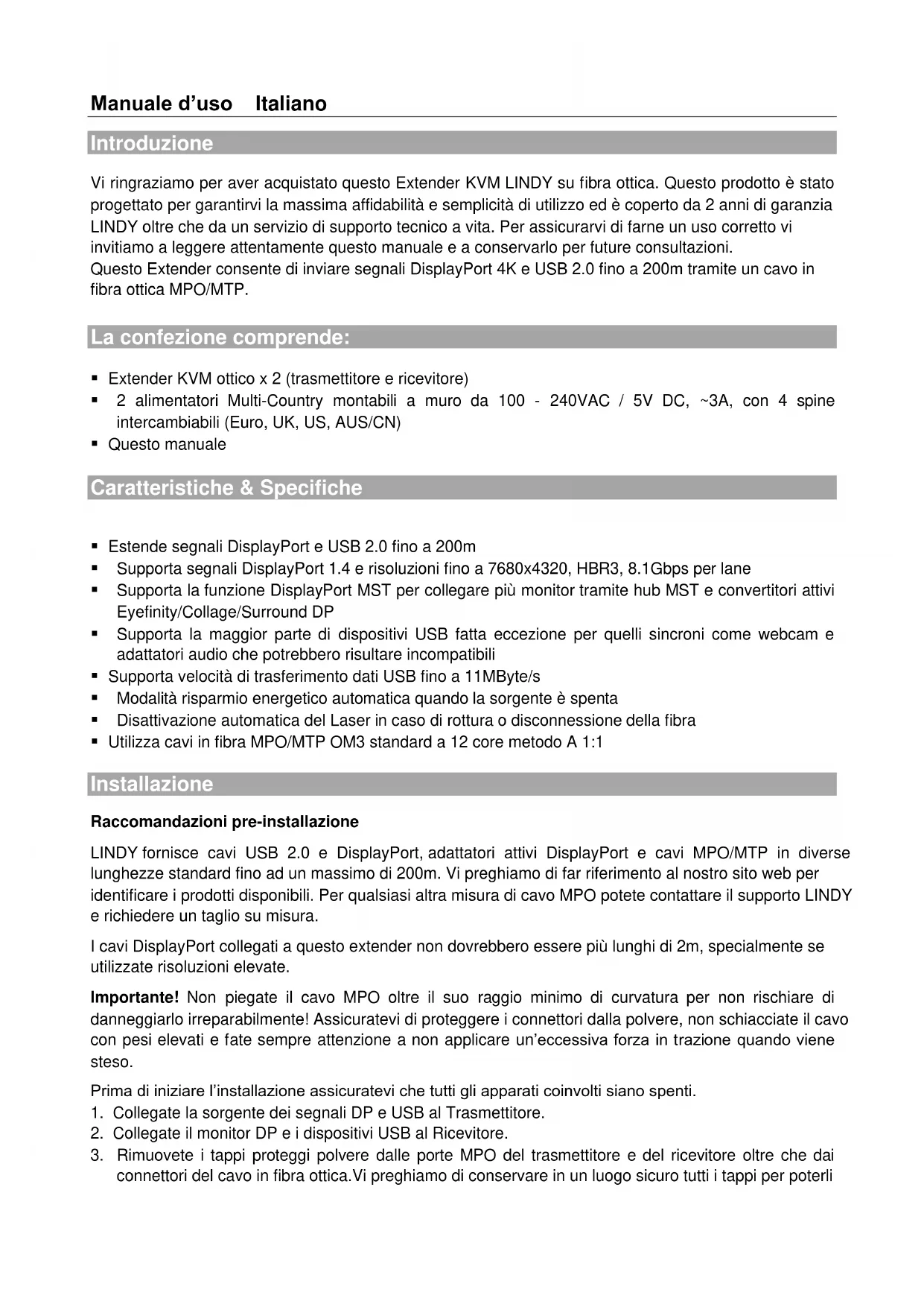 Introduzione Vi ringraziamo per aver acquistato questo Extender KVM LINDY su fibra ottica. Questo prodotto è stato progettato per garantirvi la massima affidabilità e semplicità di utilizzo ed è coperto da 2 anni di garanzia LINDY oltre che da un servizio di supporto tecnico a vita. Per assicurarvi di farne un uso corretto vi invitiamo a leggere attentamente questo manuale e a conservarlo per future consultazioni. Questo Extender consente di inviare segnali DisplayPort 4K e USB 2.0 fino a 200m tramite un cavo in fibra ottica MPO/MTP. La confezione comprende: Extender KVM ottico x 2 (trasmettitore e ricevitore) 2 alimentatori Multi-Country montabili a muro da 100 - 240VAC / 5V DC, ~3A, con 4 spine intercambiabili (Euro, UK, US, AUS/CN) Questo manuale Caratteristiche & Specifiche Estende segnali DisplayPort e USB 2.0 fino a 200m Supporta segnali DisplayPort 1.4 e risoluzioni fino a 7680x4320, HBR3, 8.1Gbps per lane Supporta la funzione DisplayPort MST per collegare più monitor tramite hub MST e convertitori attivi Eyefinity/Collage/Surround DP Supporta la maggior parte di dispositivi USB fatta eccezione per quelli sincroni come webcam e adattatori audio che potrebbero risultare incompatibili Supporta velocità di trasferimento dati USB fino a 11MByte/s Modalità risparmio energetico automatica quando la sorgente è spenta Disattivazione automatica del Laser in caso di rottura o disconnessione della fibra Utilizza cavi in fibra MPO/MTP OM3 standard a 12 core metodo A 1:1 Installazione Raccomandazioni pre-installazione LINDY fornisce cavi USB 2.0 e DisplayPort, adattatori attivi DisplayPort e cavi MPO/MTP in diverse lunghezze standard fino ad un massimo di 200m. Vi preghiamo di far riferimento al nostro sito web per identificare i prodotti disponibili. Per qualsiasi altra misura di cavo MPO potete contattare il supporto LINDY e richiedere un taglio su misura. I cavi DisplayPort collegati a questo extender non dovrebbero essere più lunghi di 2m, specialmente se utilizzate risoluzioni elevate. Importante! Non piegate il cavo MPO oltre il suo raggio minimo di curvatura per non rischiare di danneggiarlo irreparabilmente! Assicuratevi di proteggere i connettori dalla polvere, non schiacciate il cavo con pesi elevati e fate sempre attenzione a non applicare un’eccessiva forza in trazione quando viene steso. Prima di iniziare l’installazione assicuratevi che tutti gli apparati coinvolti siano spenti.