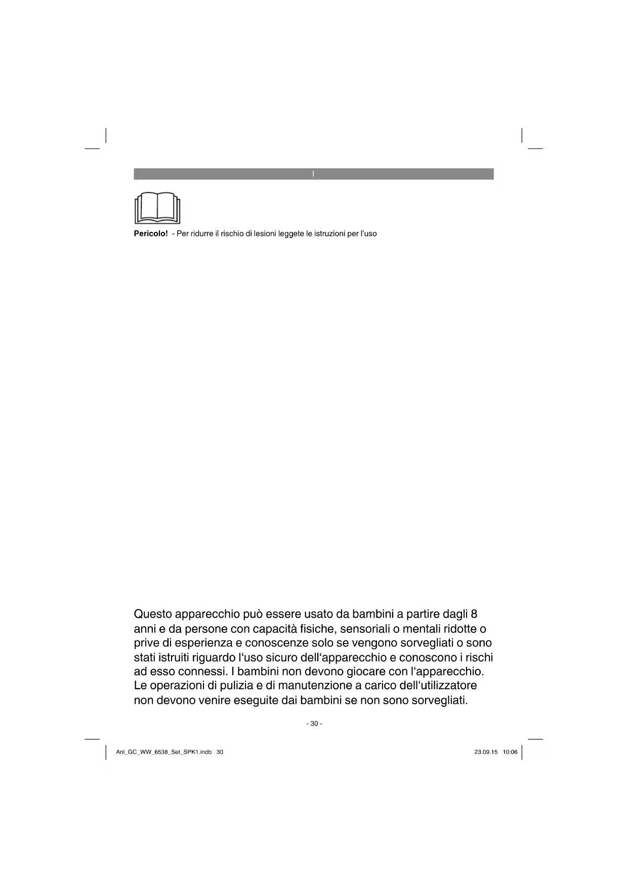 Pericolo! - Per ridurre il rischio di lesioni leggete le istruzioni per l’uso Questo apparecchio può essere usato da bambini a partire dagli 8 anni e da persone con capacità fi siche, sensoriali o mentali ridotte o prive di esperienza e conoscenze solo se vengono sorvegliati o sono stati istruiti riguardo l‘uso sicuro dell‘apparecchio e conoscono i rischi ad esso connessi. I bambini non devono giocare con l‘apparecchio. Le operazioni di pulizia e di manutenzione a carico dell‘utilizzatore non devono venire eseguite dai bambini se non sono sorvegliati. Anl_GC_WW_6538_Set_SPK1.indb 30Anl_GC_WW_6538_Set_SPK1.indb 30 23.09.15 10:0623.09.15 10:06I