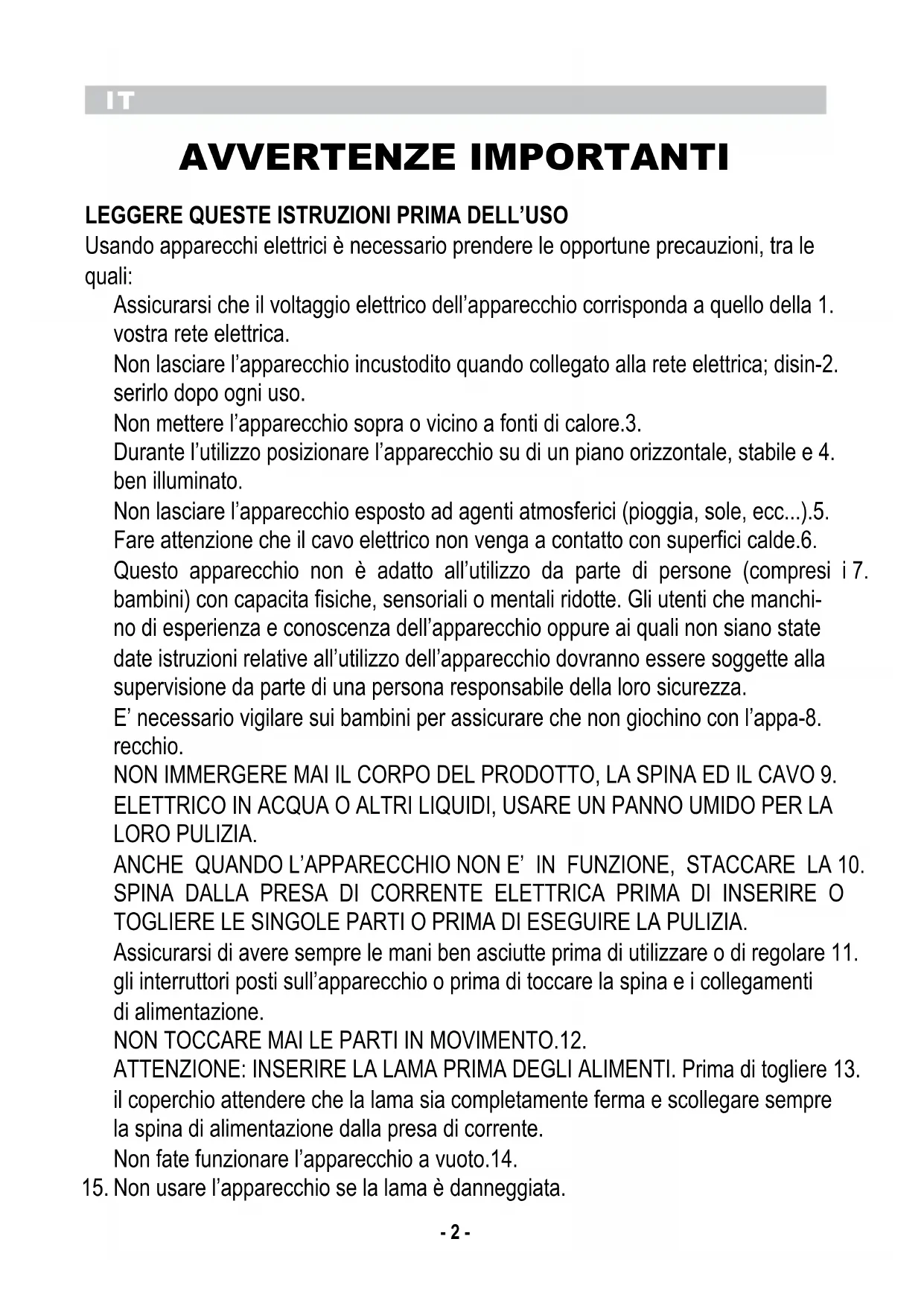 AVVERTENZE IMPORTANTI LEGGERE QUESTE ISTRUZIONI PRImA DELL’USO Usando apparecchi elettrici è necessario prendere le opportune precauzioni, tra le quali: Assicurarsi che il voltaggio elettrico dell’apparecchio corrisponda a quello della 1. vostra rete elettrica. Non lasciare l’apparecchio incustodito quando collegato alla rete elettrica; disin-2. serirlo dopo ogni uso. Non mettere l’apparecchio sopra o vicino a fonti di calore.3. Durante l’utilizzo posizionare l’apparecchio su di un piano orizzontale, stabile e 4. ben illuminato. Non lasciare l’apparecchio esposto ad agenti atmosferici (pioggia, sole, ecc...).5. Fare attenzione che il cavo elettrico non venga a contatto con superfici calde.6. Questo apparecchio non è adatto all’utilizzo da parte di persone (compresi i 7. bambini) con capacita fisiche, sensoriali o mentali ridotte. Gli utenti che manchi- no di esperienza e conoscenza dell’apparecchio oppure ai quali non siano state date istruzioni relative all’utilizzo dell’apparecchio dovranno essere soggette alla supervisione da parte di una persona responsabile della loro sicurezza. E’ necessario vigilare sui bambini per assicurare che non giochino con l’appa-8. recchio. NON IMMERGERE MAI IL CORPO DEL PRODOTTO, LA SPINA ED IL CAVO 9. ELETTRICO IN ACQUA O ALTRI LIQUIDI, USARE UN PANNO UMIDO PER LA LORO PULIZIA. ANCHE QUANDO L’APPARECCHIO NON E’ IN FUNZIONE, STACCARE LA 10. SPINA DALLA PRESA DI CORRENTE ELETTRICA PRIMA DI INSERIRE O TOGLIERE LE SINGOLE PARTI O PRIMA DI ESEGUIRE LA PULIZIA. Assicurarsi di avere sempre le mani ben asciutte prima di utilizzare o di regolare 11. gli interruttori posti sull’apparecchio o prima di toccare la spina e i collegamenti di alimentazione. NON TOCCARE MAI LE PARTI IN MOVIMENTO.12. ATTENZIONE: INSERIRE LA LAMA PRIMA DEGLI ALIMENTI. Prima di togliere 13. il coperchio attendere che la lama sia completamente ferma e scollegare sempre la spina di alimentazione dalla presa di corrente. Non fate funzionare l’apparecchio a vuoto.14. Non usare l’apparecchio se la lama è danneggiata.15.IT