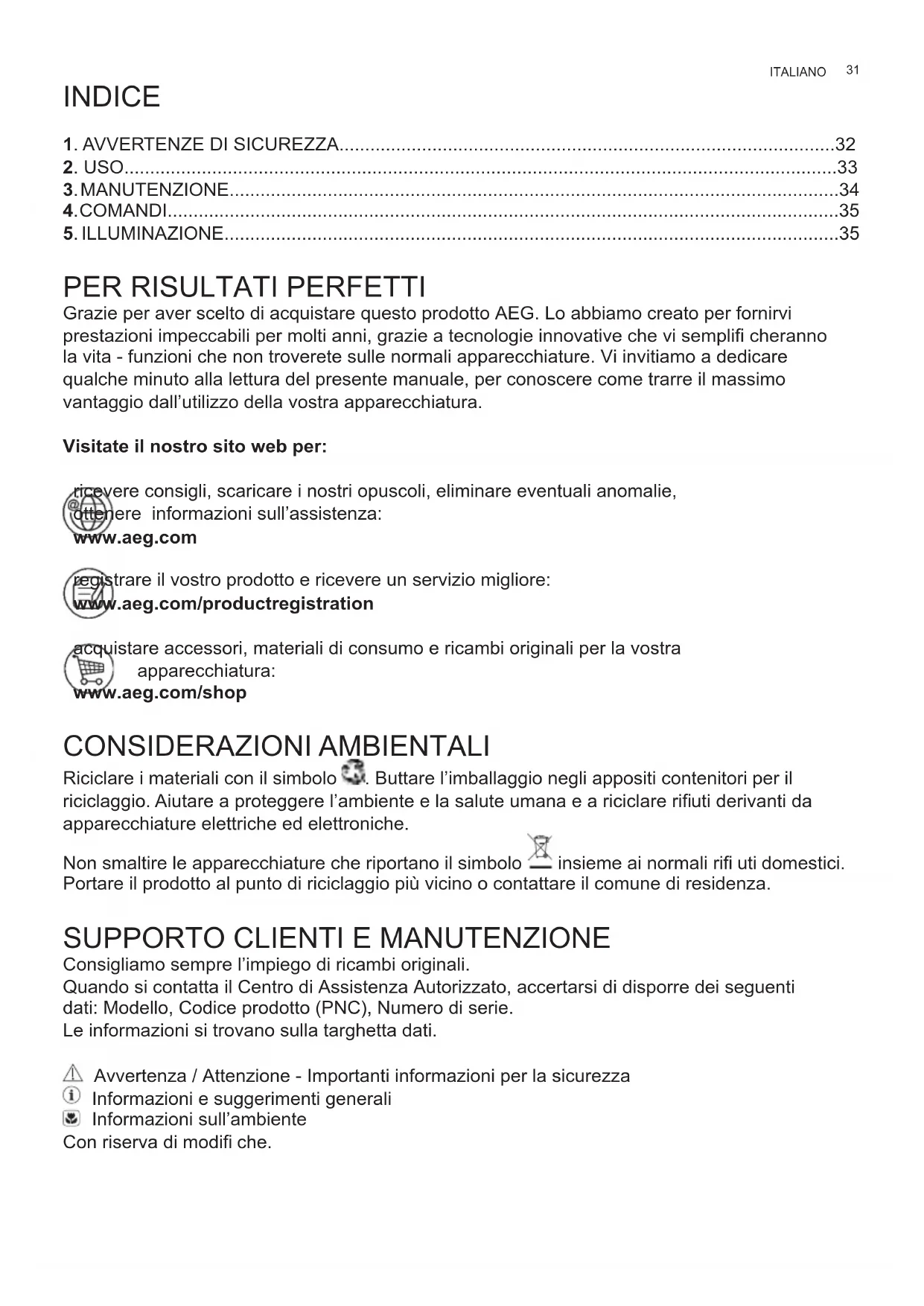 Consigliamo sempre l’impiego di ricambi originali. Quando si contatta il Centro di Assistenza Autorizzato, accertarsi di disporre dei seguenti dati: Modello, Codice prodotto (PNC), Numero di serie. Le informazioni si trovano sulla targhetta dati. Avvertenza / Attenzione - Importanti informazioni per la sicurezza Informazioni e suggerimenti generali Informazioni sull’ambiente Con riserva di modifi che. ITALIANO32 www.aeg.com