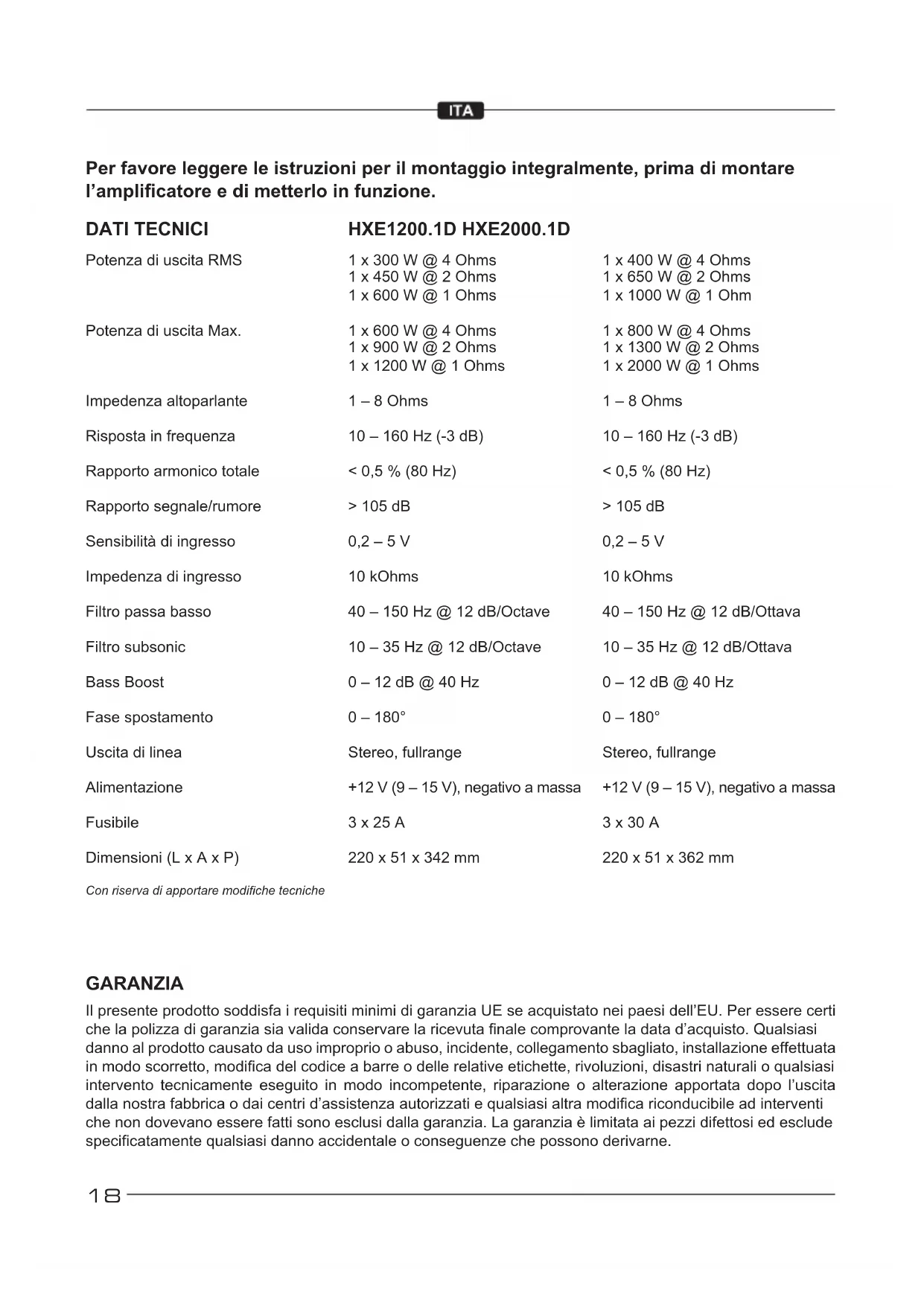 5.Faiteseffectuerparvotremécanicienunessaidechargeauniveaudel’alternateuretdelabatterie.Vériezquelecircuit électriqueduvéhiculefonctionnecorrectement,notammentledistributeur,lesbougiesetleurscâbles,lerégulateurdetension,etc.18 Per favore leggere le istruzioni per il montaggio integralmente, prima di montare l’amplicatore e di metterlo in funzione. Con riserva di apportare modiche tecniche GARANZIA Il presente prodotto soddisfa i requisiti minimi di garanzia UE se acquistato nei paesi dell’EU. Per essere certi chelapolizzadigaranziasiavalidaconservarelaricevutanalecomprovanteladatad’acquisto.Qualsiasi danno al prodotto causato da uso improprio o abuso, incidente, collegamento sbagliato, installazione effettuata inmodoscorretto,modicadelcodiceabarreodellerelativeetichette,rivoluzioni,disastrinaturalioqualsiasi intervento tecnicamente eseguito in modo incompetente, riparazione o alterazione apportata dopo l’uscita dallanostrafabbricaodaicentrid’assistenzaautorizzatiequalsiasialtramodicariconducibileadinterventi chenondovevanoesserefattisonoesclusidallagaranzia.Lagaranziaèlimitataaipezzidifettosiedesclude specicatamentequalsiasidannoaccidentaleoconseguenzechepossonoderivarne. DATI TECNICI Potenza di uscita RMS Potenza di uscita Max. Impedenza altoparlante Risposta in frequenza Rapporto armonico totale Rapporto segnale/rumore Sensibilitàdiingresso Impedenza di ingresso Filtro passa basso Filtro subsonic Bass Boost Fase spostamento Uscita di linea Alimentazione Fusibile Dimensioni (L x A x P) 1 x 300 W @ 4 Ohms 1 x 450 W @ 2 Ohms 1 x 600 W @ 1 Ohms 1 x 600 W @ 4 Ohms 1 x 900 W @ 2 Ohms 1 x 1200 W @ 1 Ohms 1 – 8 Ohms 10 – 160 Hz (-3 dB) < 0,5 % (80 Hz) > 105 dB 0,2 – 5 V 10 kOhms 40 – 150 Hz @ 12 dB/Octave 10 – 35 Hz @ 12 dB/Octave 0 – 12 dB @ 40 Hz 0 – 180° Stereo, fullrange +12 V (9 – 15 V), negativo a massa 3 x 25 A 220 x 51 x 342 mm 1 x 400 W @ 4 Ohms 1 x 650 W @ 2 Ohms 1 x 1000 W @ 1 Ohm 1 x 800 W @ 4 Ohms 1 x 1300 W @ 2 Ohms 1 x 2000 W @ 1 Ohms 1 – 8 Ohms 10 – 160 Hz (-3 dB) < 0,5 % (80 Hz) > 105 dB 0,2 – 5 V 10 kOhms 40 – 150 Hz @ 12 dB/Ottava 10 – 35 Hz @ 12 dB/Ottava 0 – 12 dB @ 40 Hz 0 – 180° Stereo, fullrange +12 V (9 – 15 V), negativo a massa 3 x 30 A 220 x 51 x 362 mm