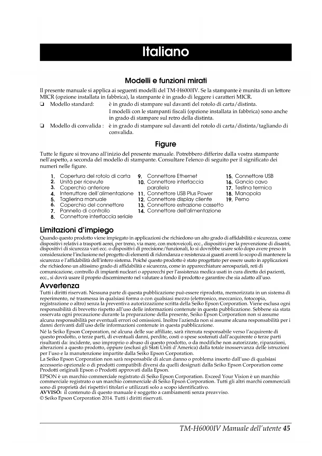 English Italiano Modelli e funzioni mirati Il presente manuale si applica ai seguenti modelli del TM-H6000IV. Se la stampante è munita di un lettore MICR (opzione installata in fabbrica), la stampante è in grado di leggere i caratteri MICR. ❏ Modello standard: è in grado di stampare sul davanti del rotolo di carta/distinta. I modelli con le stampanti fiscali (opzione installata in fabbrica) sono anche in grado di stampare sul retro della distinta. ❏ Modello di convalida : è in grado di stampare sul davanti del rotolo di carta/distinta/tagliando di convalida. Figure Tutte le figure si trovano all'inizio del presente manuale. Potrebbero differire dalla vostra stampante nell'aspetto, a seconda del modello di stampante. Consultare l'elenco di seguito per il significato dei numeri nelle figure. Limitazioni d’impiego Quando questo prodotto viene impiegato in applicazioni che richiedono un alto grado di affidabilità e sicurezza, come dispositivi relativi a trasporti aerei, per treno, via mare, con motoveicoli, ecc., dispositivi per la prevenzione di disastri, dispositivi di sicurezza vari ecc. o dispositivi di precisione/funzionali, lo si dovrebbe usare solo dopo avere preso in considerazione l’inclusione nel progetto di elementi di ridondanza e resistenza ai guasti aventi lo scopo di mantenere la sicurezza e l’affidabilità dell’intero sistema. Poiché questo prodotto è stato progettato per essere usato in applicazioni che richiedono un altissimo grado di affidabilità e sicurezza, come in apparecchiature aerospaziali, reti di comunicazione, controllo di impianti nucleari o apparecchi per l’assistenza medica usati in cura diretta dei pazienti, ecc., si dovrà usare il proprio discernimento nel valutare a fondo il prodotto e garantire che sia adatto all’uso. Avvertenza Tutti i diritti riservati. Nessuna parte di questa pubblicazione può essere riprodotta, memorizzata in un sistema di reperimento, né trasmessa in qualsiasi forma o con qualsiasi mezzo (elettronico, meccanico, fotocopia, registrazione o altro) senza la preventiva autorizzazione scritta della Seiko Epson Corporation. Viene esclusa ogni responsabilità di brevetto rispetto all’uso delle informazioni contenute in questa pubblicazione. Sebbene sia stata osservata ogni precauzione durante la preparazione della presente, Seiko Epson Corporation non si assume alcuna responsabilità per eventuali errori od omissioni. Inoltre l'azienda non si assume alcuna responsabilità per i danni derivanti dall'uso delle informazioni contenute in questa pubblicazione. Né la Seiko Epson Corporation, né alcuna delle sue affiliate, sarà ritenuta responsabile verso l’acquirente di questo prodotto, o terze parti, di eventuali danni, perdite, costi o spese sostenuti dall’acquirente o terze parti risultanti da: incidente, uso improprio o abuso di questo prodotto, o da modifiche non autorizzate, riparazioni, alterazioni a questo prodotto, oppure (esclusi gli Stati Uniti d’America) dalla totale inosservanza delle istruzioni per l’uso e la manutenzione impartite dalla Seiko Epson Corporation. La Seiko Epson Corporation non sarà responsabile di alcun danno o problema insorto dall’uso di qualsiasi accessorio opzionale o di prodotti compatibili diversi da quelli designati dalla Seiko Epson Corporation come Prodotti originali Epson o Prodotti approvati dalla Epson. EPSON è un marchio commerciale registrato di Seiko Epson Corporation. Exceed Your Vision è un marchio commerciale registrato o un marchio commerciale di Seiko Epson Corporation. Tutti gli altri marchi commerciali sono di proprietà dei rispettivi titolari e utilizzati solo a scopo identificativo. AVVISO: il contenuto di questo manuale è soggetto a cambiamenti senza preavviso. © Seiko Epson Corporation 2014. Tutti i diritti riservati.