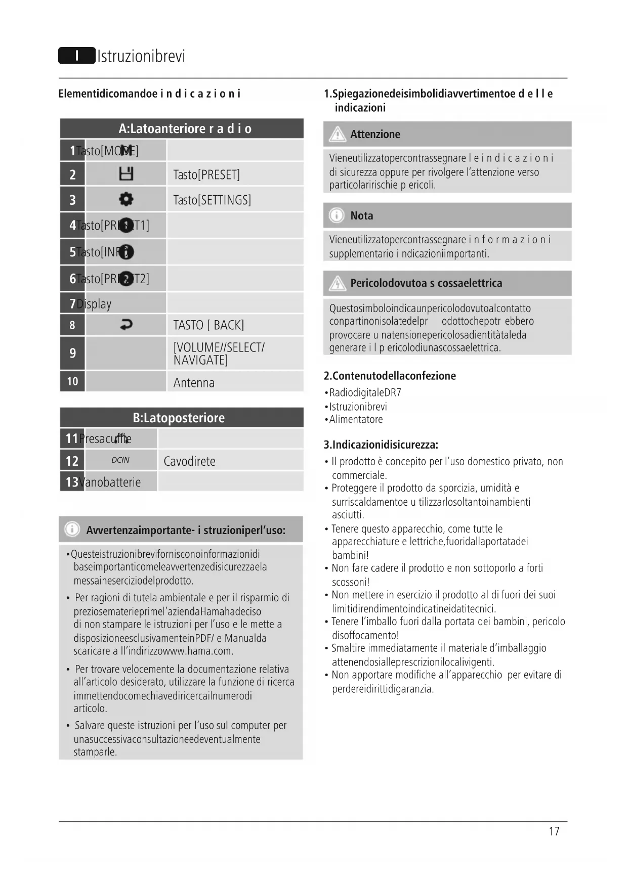 Scarica le istruzioni per il tuo Radio in formato PDF gratuitamente! Trova il tuo manuale DR7 - HAMA e riprendi in mano il tuo dispositivo elettronico. In questa pagina sono pubblicati tutti i documenti necessari per l'utilizzo del tuo dispositivo. DR7 del marchio HAMA.