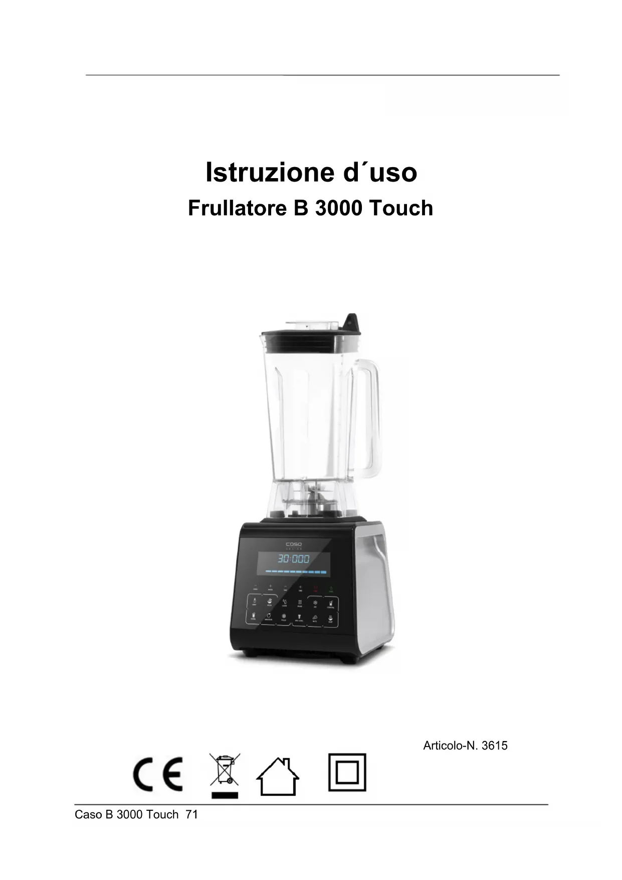Scarica le istruzioni per il tuo Frullatore in formato PDF gratuitamente! Trova il tuo manuale B3000 - CASO e riprendi in mano il tuo dispositivo elettronico. In questa pagina sono pubblicati tutti i documenti necessari per l'utilizzo del tuo dispositivo. B3000 del marchio CASO.