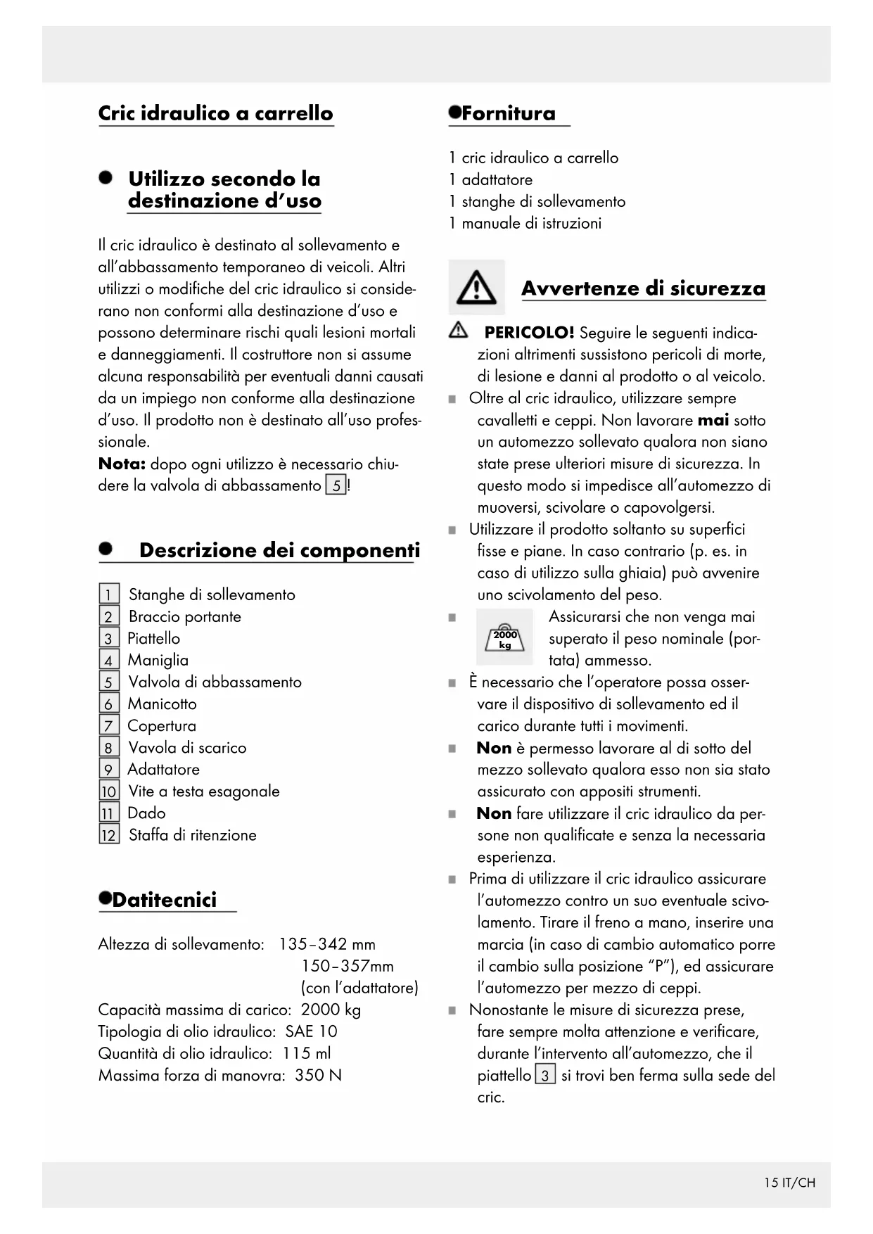 on. Cette garantie ne s’étend pas aux pièces du produit soumises à une usure normale (p. ex. des batteries) et qui, par conséquent, peuvent être considérées comme des pièces d’usure, ni aux dommages sur des composants fragiles, comme des interrupteurs, des batteries et des éléments fabriqués en verre.15 IT/CH Cric idraulico a carrello Utilizzo secondo la destinazione d’uso Il cric idraulico è destinato al sollevamento e all’abbassamento temporaneo di veicoli. Altri utilizzi o modifiche del cric idraulico si conside- rano non conformi alla destinazione d’uso e possono determinare rischi quali lesioni mortali e danneggiamenti. Il costruttore non si assume alcuna responsabilità per eventuali danni causati da un impiego non conforme alla destinazione d’uso. Il prodotto non è destinato all’uso profes- sionale. Nota: dopo ogni utilizzo è necessario chiu- dere la valvola di abbassamento