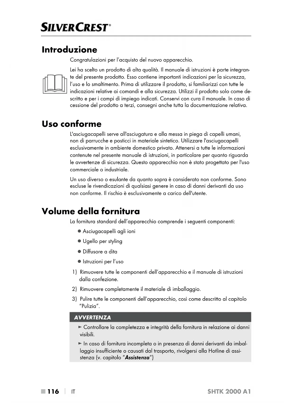 IT SHTK 2000 A1 Introduzione Congratulazioni per l’acquisto del nuovo apparecchio. Lei ha scelto un prodotto di alta qualità. Il manuale di istruzioni è parte integran- te del presente prodotto. Esso contiene importanti indicazioni per la sicurezza, l’uso e lo smaltimento. Prima di utilizzare il prodotto, si familiarizzi con tutte le indicazioni relative ai comandi e alla sicurezza. Utilizzi il prodotto solo come de- scritto e per i campi di impiego indicati. Conservi con cura il manuale. In caso di cessione del prodotto a terzi, consegni anche tutta la documentazione relativa. Uso conforme L'asciugacapelli serve all'asciugatura e alla messa in piega di capelli umani, non di parrucche e posticci in materiale sintetico. Utilizzare l'asciugacapelli esclusivamente in ambiente domestico privato. Attenersi a tutte le informazioni contenute nel presente manuale di istruzioni, in particolare per quanto riguarda le avvertenze di sicurezza. Questo apparecchio non è stato progettato per l'uso commerciale o industriale. Un uso diverso o esulante da quanto sopra è considerato non conforme. Sono escluse le rivendicazioni di qualsiasi genere in caso di danni derivanti da uso non conforme. Il rischio è esclusivamente a carico dell'utente. Volume della fornitura La fornitura standard dell’apparecchio comprende i seguenti componenti: ▯ Asciugacapelli agli ioni ▯ Ugello per styling ▯ Diffusore a dita ▯ Istruzioni per l’uso