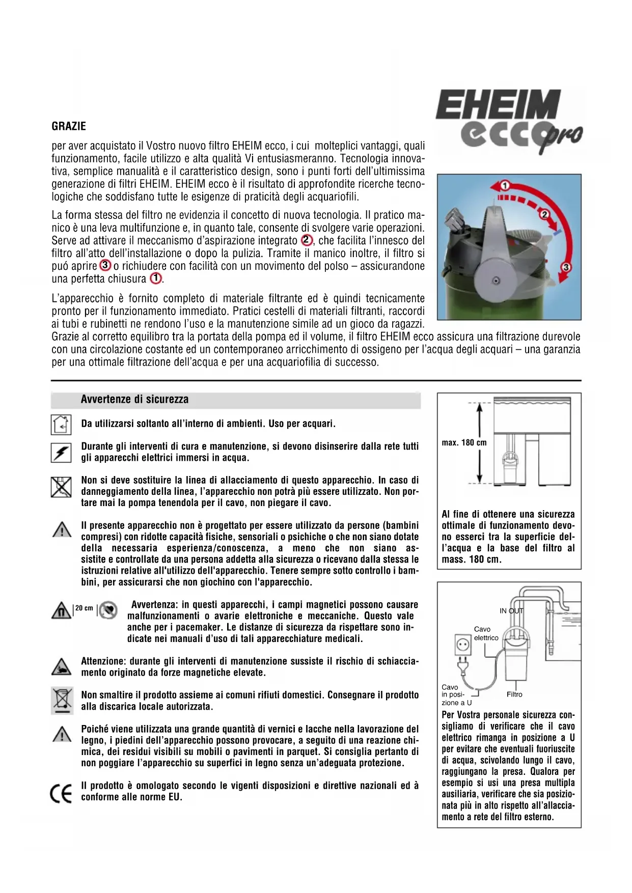 N - R Rengøring og pleje S - U Pumpekammer, kugleventil og O-ring ko zh bg ru tr ro sl sk pl hu cs el pt es it da fi no sv nl fr en deGRAZIE per aver acquistato il Vostro nuovo filtro EHEIM ecco, i cui molteplici vantaggi, quali funzionamento, facile utilizzo e alta qualità Vi entusiasmeranno. Tecnologia innova- tiva, semplice manualità e il caratteristico design, sono i punti forti dell’ultimissima generazione di filtri EHEIM. EHEIM ecco è il risultato di approfondite ricerche tecno- logiche che soddisfano tutte le esigenze di praticità degli acquariofili. La forma stessa del filtro ne evidenzia il concetto di nuova tecnologia. Il pratico ma- nico è una leva multifunzione e, in quanto tale, consente di svolgere varie operazioni. Serve ad attivare il meccanismo d’aspirazione integrato , che facilita l’innesco del filtro all’atto dell’installazione o dopo la pulizia. Tramite il manico inoltre, il filtro si puó aprire o richiudere con facilità con un movimento del polso – assicurandone una perfetta chiusura . L’apparecchio è fornito completo di materiale filtrante ed è quindi tecnicamente pronto per il funzionamento immediato. Pratici cestelli di materiali filtranti, raccordi ai tubi e rubinetti ne rendono l’uso e la manutenzione simile ad un gioco da ragazzi. Grazie al corretto equilibro tra la portata della pompa ed il volume, il filtro EHEIM ecco assicura una filtrazione durevole con una circolazione costante ed un contemporaneo arricchimento di ossigeno per l’acqua degli acquari – una garanzia per una ottimale filtrazione dell’acqua e per una acquariofilia di successo.