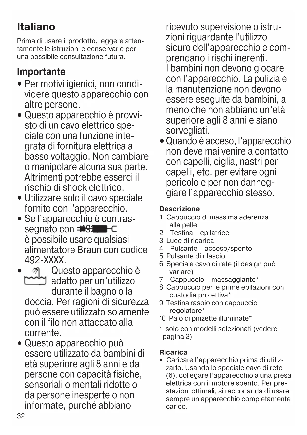 Se l’apparecchio è contras- segnato con 492, è possibile usare qualsiasi alimentatore Braun con codice 492-XXXX.