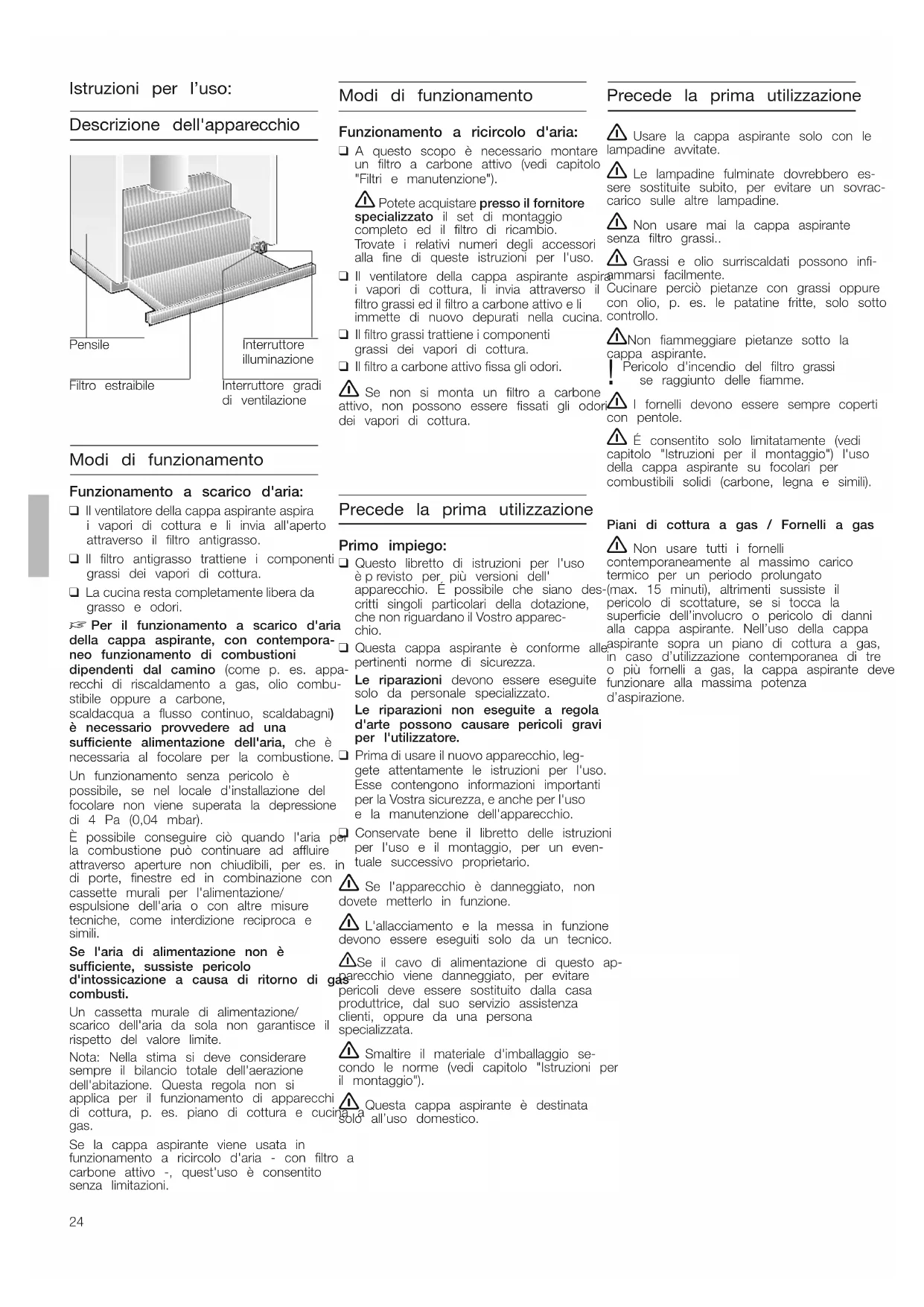 d'utilisation). Remarque: vous pouvez habiller le corps de hotte à l'intérieur du placard (par ex. avec des panneaux d'aggloméré). Lors de cette opération, respectez les consignes suivantes: –Le fond intermédiaire ne doit pas reposer sur le corps de hotte. –Ne fixez pas l'habillage mentionné ci-dessus sur le corps de hotte. –Le SAV doit pouvoir avoir libre accès à la hotte. Démontage: Le démontage a lieu dans l'ordre chronologique inverse. Remarque: Lorsque la hotte recycle l'air, vous devez démonter le filtre à charbon actif et le support en plastique pour pouvoir accéder aux vis de fixation et aux accessoires de montage. Poid en kg: Sous réserve de modifications constructives dans l'inté- rêt du progrès technique. Air évacué à l'extérieur Air recyclé par un fil- tre au charbon actif 9,5 10,524 Descrizione dell'apparecchio Modi di funzionamento Funzionamento a scarico d'aria: ❑ Il ventilatore della cappa aspirante aspira i vapori di cottura e li invia all'apertoattraverso il filtro antigrasso.❑ Il filtro antigrasso trattiene i componentigrassi dei vapori di cottura. ❑ La cucina resta completamente libera da grasso e odori. Per il funzionamento a scarico d'ariadella cappa aspirante, con contempora-neo funzionamento di combustionidipendenti dal camino (come p. es. appa-recchi di riscaldamento a gas, olio combu-stibile oppure a carbone,scaldacqua a flusso continuo, scaldabagni)è necessario provvedere ad unasufficiente alimentazione dell'aria, che ènecessaria al focolare per la combustione.Un funzionamento senza pericolo èpossibile, se nel locale d'installazione delfocolare non viene superata la depressionedi 4 Pa (0,04 mbar).È possibile conseguire ciò quando l'aria perla combustione può continuare ad affluireattraverso aperture non chiudibili, per es. indi porte, finestre ed in combinazione concassette murali per l'alimentazione/espulsione dell'aria o con altre misuretecniche, come interdizione reciproca esimili.Se l'aria di alimentazione non èsufficiente, sussiste pericolod'intossicazione a causa di ritorno di gascombusti.Un cassetta murale di alimentazione/scarico dell'aria da sola non garantisce ilrispetto del valore limite.Nota: Nella stima si deve consideraresempre il bilancio totale dell'aerazionedell'abitazione. Questa regola non siapplica per il funzionamento di apparecchidi cottura, p. es. piano di cottura e cucina a gas. Se la cappa aspirante viene usata infunzionamento a ricircolo d'aria - con filtro acarbone attivo -, quest'uso è consentitosenza limitazioni. Modi di funzionamento Istruzioni per l’uso: Interruttore gradidi ventilazionePensileFiltro estraibileInterruttoreilluminazione Funzionamento a ricircolo d'aria: ❑ A questo scopo è necessario montareun filtro a carbone attivo (vedi capitolo"Filtri e manutenzione"). Potete acquistare presso il fornitore specializzato il set di montaggiocompleto ed il filtro di ricambio.Trovate i relativi numeri degli accessorialla fine di queste istruzioni per l'uso.❑ Il ventilatore della cappa aspirante aspirai vapori di cottura, li invia attraverso il filtro grassi ed il filtro a carbone attivo e li immette di nuovo depurati nella cucina. ❑ Il filtro grassi trattiene i componenti grassi dei vapori di cottura. ❑ Il filtro a carbone attivo fissa gli odori. Se non si monta un filtro a carbone attivo, non possono essere fissati gli odoridei vapori di cottura. Precede la prima utilizzazione Primo impiego: ❑ Questo libretto di istruzioni per l'usoèprevisto per più versioni dell'apparecchio. É possibile che siano des-critti singoli particolari della dotazione, che non riguardano il Vostro apparec- chio.❑ Questa cappa aspirante è conforme allepertinenti norme di sicurezza.Le riparazioni devono essere eseguitesolo da personale specializzato.Le riparazioni non eseguite a regolad'arte possono causare pericoli graviper l'utilizzatore. ❑ Prima di usare il nuovo apparecchio, leg- gete attentamente le istruzioni per l'uso.Esse contengono informazioni importanti per la Vostra sicurezza, eanche per l'uso e la manutenzione dell'apparecchio.❑ Conservate bene il libretto delle istruzioniper l'uso e il montaggio, per un even-tuale successivo proprietario. Se l'apparecchio è danneggiato, non dovete metterlo in funzione. L'allacciamento e la messa in funzione devono essere eseguiti solo da un tecnico. Se il cavo di alimentazione di questo ap- parecchio viene danneggiato, per evitarepericoli deve essere sostituito dalla casaproduttrice, dal suo servizio assistenzaclienti, oppure da una personaspecializzata. Smaltire il materiale d'imballaggio se- condo le norme (vedi capitolo "Istruzioni peril montaggio"). Questa cappa aspirante è destinata solo all’uso domestico. Precede la prima utilizzazione Usare la cappa aspirante solo con le lampadine avvitate. Le lampadine fulminate dovrebbero es- sere sostituite subito, per evitare un sovrac-carico sulle altre lampadine. Non usare mai la cappa aspirante senza filtro grassi.. Grassi e olio surriscaldati possono infi- ammarsi facilmente.Cucinare perciò pietanze con grassi oppurecon olio, p. es. le patatine fritte, solo sottocontrollo. Non fiammeggiare pietanze sotto la cappa aspirante.Pericolo d'incendio del filtro grassi ! se raggiunto delle fiamme. I fornelli devono essere sempre coperti con pentole. É consentito solo limitatamente (vedi capitolo "Istruzioni per il montaggio") l'usodella cappa aspirante su focolari percombustibili solidi (carbone, legna e simili).Piani di cottura a gas / Fornelli a gas Non usare tutti i fornelli contemporaneamente al massimo caricotermico per un periodo prolungato(max. 15 minuti), altrimenti sussiste ilpericolo di scottature, se si tocca lasuperficie dell’involucro o pericolo di dannialla cappa aspirante. Nell’uso della cappaaspirante sopra un piano di cottura a gas,in caso d’utilizzazione contemporanea di treo più fornelli a gas, la cappa aspirante devefunzionare alla massima potenzad’aspirazione.25 GuastiIn 