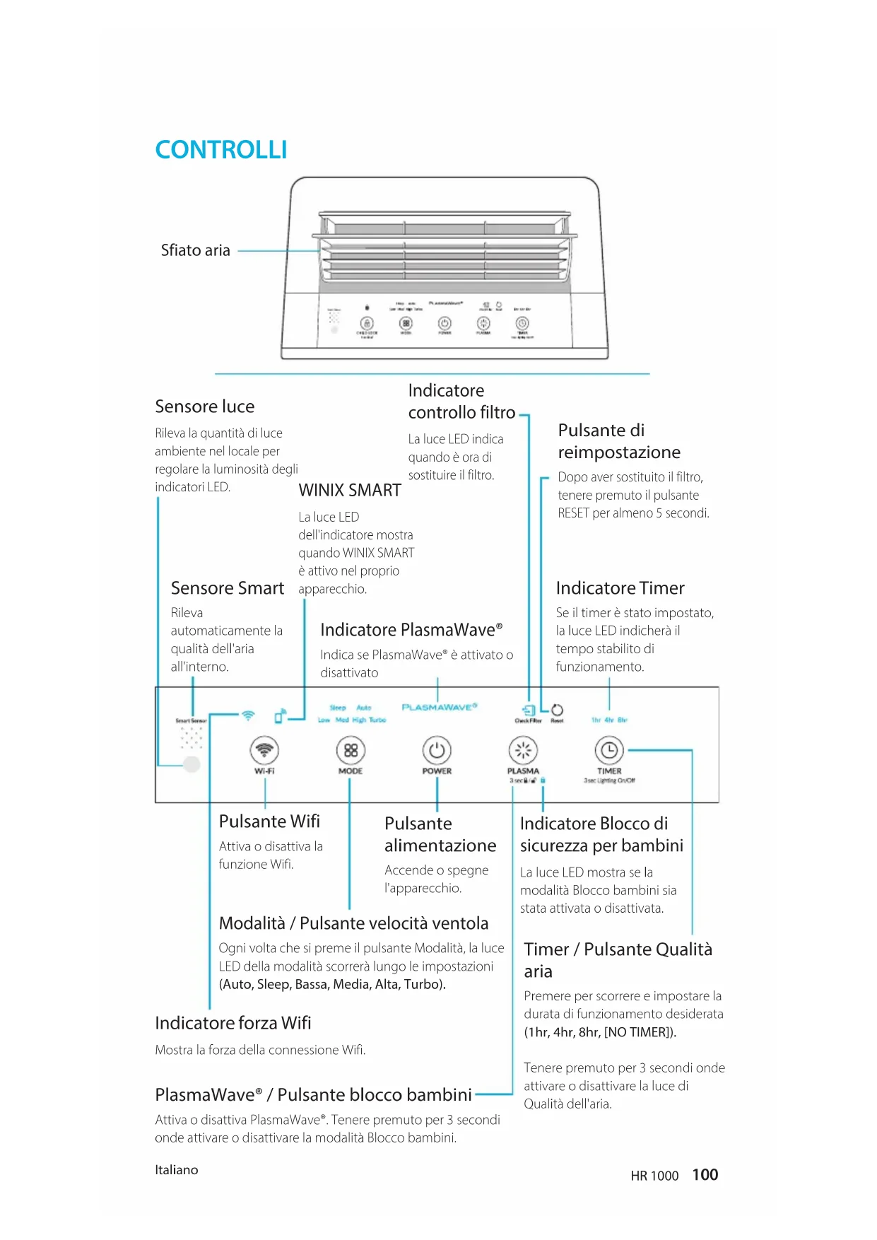 Italiano HR 1000 Sensore luce Rileva la quantità di luce ambiente nel locale per regolare la luminosità degli indicatori LED. Indicatore Timer Se il timer è stato impostato, la luce LED indicherà il tempo stabilito di funzionamento. Indicatore PlasmaWave® Indica se PlasmaWave® è attivato o disattivato Sensore Smart Rileva automaticamente la qualità dell'aria all'interno. Indicatore Blocco di sicurezza per bambini La luce LED mostra se la modalità Blocco bambini sia stata attivata o disattivata. Indicatore forza Wifi Mostra la forza della connessione Wifi. Modalità / Pulsante velocità ventola Ogni volta che si preme il pulsante Modalità, la luce LED della modalità scorrerà lungo le impostazioni (Auto, Sleep, Bassa, Media, Alta, Turbo). Pulsante alimentazione Accende o spegne l'apparecchio. Timer / Pulsante Qualità aria Premere per scorrere e impostare la durata di funzionamento desiderata (1hr, 4hr, 8hr, [NO TIMER]). Tenere premuto per 3 secondi onde attivare o disattivare la luce di Qualità dell'aria. PlasmaWave® / Pulsante blocco bambini Attiva o disattiva PlasmaWave®. Tenere premuto per 3 secondi onde attivare o disattivare la modalità Blocco bambini. Indicatore controllo filtro La luce LED indica quando è ora di sostituire il filtro. Pulsante di reimpostazione Dopo aver sostituito il filtro, tenere premuto il pulsante RESET per almeno 5 secondi. CONTROLLI Pulsante Wifi Attiva o disattiva la funzione Wifi. WINIX SMART La luce LED dell'indicatore mostra quando WINIX SMART è attivo nel proprio apparecchio. Sfiato ariaSetup | Installazione Italiano HR 1000 AVVERTENZA Seguire le presenti istruzioni per ridurre il rischio di lesioni gravi o morte, oltre a quello di danneggiare l'apparecchio. DOVE UTILIZZARE Non utilizzare in caso di nebbie o fumi di oli industriali, o di grandi quantità di polveri metalliche.Non installare in alcun tipo di motore o veicolo di trasporto (camion, barche, navi, ecc.)Non collocare presso materiali infiammabili (aerosol, combustibili, gas, ecc.)Non collocare sotto prese elettricheNon collocare presso elementi riscaldantiNon collocare in aree con eccessiva presenza di gas nociviNon collocare l'apparecchio di fronte a vento o correnti d'ariaNon collocare in aree eccessivamente umide, dove l'apparecchio potrebbe bagnarsiLasciare 30 ~ 46 cm di spazio tra TV, radio e altri apparecchi elettroniciCollocare all'interno, lontano dalla luce diretta del solel'esposizione diretta può causare malfunzionamenti o guasti nel prodotto.Collocare esclusivamente su superfici rigide e piattesuperfici fragili o inclinate possono risultare in rumori e vibrazioni anomali. Il presente apparecchio non è progettato per la conservazione di documenti o di opere d'arte. l'interferenza elettromagnetica di alcuni dispositivi può causare malfunzionamenti nel prodotto. 30~46 cm 10 cm102 Installazione | Setup Italiano HR 1000