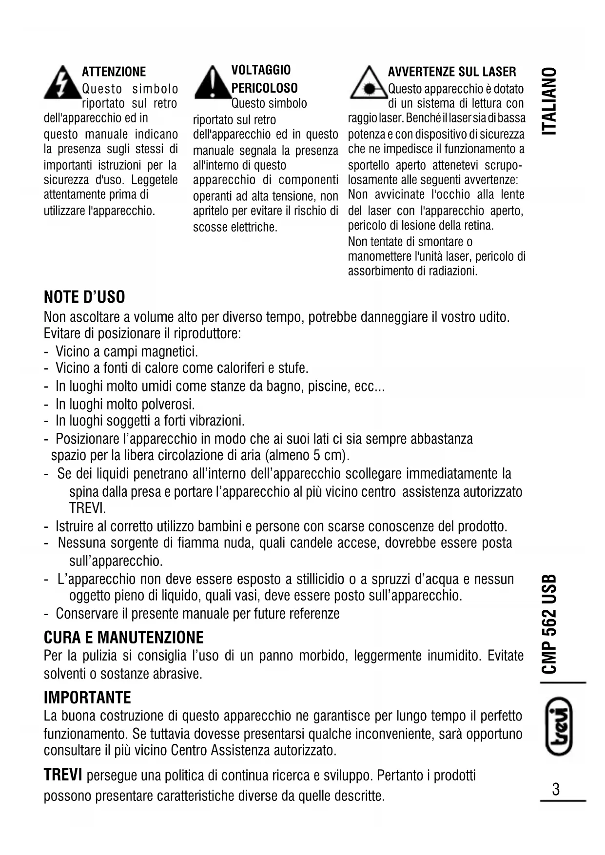 Scarica le istruzioni per il tuo Lettore/registratore cd in formato PDF gratuitamente! Trova il tuo manuale CMP 562 USB - Trevi e riprendi in mano il tuo dispositivo elettronico. In questa pagina sono pubblicati tutti i documenti necessari per l'utilizzo del tuo dispositivo. CMP 562 USB del marchio Trevi.