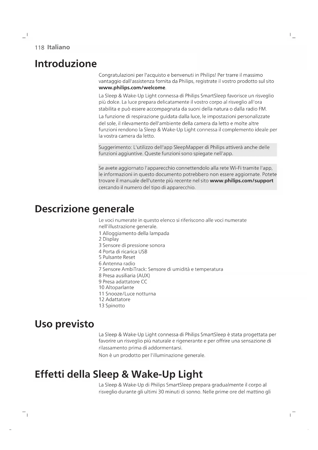 Italiano Sommario Introduzione _____________________________________________________________________________ 118 Descrizione generale_______________________________________________________________________ 118 Uso previsto ______________________________________________________________________________ 118 Effetti della Sleep & Wake-Up Light __________________________________________________________ 118 Informazioni di sicurezza importanti _________________________________________________________ 119 Sicurezza e conformità _____________________________________________________________________ 121 Campi elettromagnetici (EMF) ______________________________________________________________ 121 Icone del menu interattivo__________________________________________________________________ 121 Connessione dell'apparecchio al Wi-Fi _______________________________________________________ 122 Navigazione del menu _____________________________________________________________________ 123 Configurazione dei profili di sveglia__________________________________________________________ 124 Orario + sveglia di riserva ___________________________________________________________________ 125 Funzione Snooze __________________________________________________________________________ 126 Spegnimento della sveglia__________________________________________________________________ 126 Utilizzo dell'apparecchio come lampada per il comodino _______________________________________ 126 Luce notturna_____________________________________________________________________________ 127 Impostazioni______________________________________________________________________________ 127 Ascolto di musica__________________________________________________________________________ 128 Programmi di rilassamento _________________________________________________________________ 129 Sunset Simulation (simulazione del tramonto) ________________________________________________ 130 RelaxBreathe _____________________________________________________________________________ 130 Funzione dell'ora di dormire ________________________________________________________________ 132 Come ricaricare il telefono cellulare__________________________________________________________ 132 Pulizia e conservazione_____________________________________________________________________ 132 Riciclaggio________________________________________________________________________________ 133 Garanzia e assistenza ______________________________________________________________________ 133 Risoluzione dei problemi ___________________________________________________________________ 133 Specifiche ________________________________________________________________________________ 137 Software open source e di terze parti ________________________________________________________ 139118 Italiano Introduzione Congratulazioni per l'acquisto e benvenuti in Philips! Per trarre il massimo vantaggio dall'assistenza fornita da Philips, registrate il vostro prodotto sul sito www.philips.com/welcome. La Sleep & Wake-Up Light connessa di Philips SmartSleep favorisce un risveglio più dolce. La luce prepara delicatamente il vostro corpo al risveglio all'ora stabilita e può essere accompagnata da suoni della natura o dalla radio FM. La funzione di respirazione guidata dalla luce, le impostazioni personalizzate del sole, il rilevamento dell'ambiente della camera da letto e molte altre funzioni rendono la Sleep & Wake-Up Light connessa il complemento ideale per la vostra camera da letto. Suggerimento: L'utilizzo dell'app SleepMapper di Philips attiverà anche delle funzioni aggiuntive. Queste funzioni sono spiegate nell'app. Se avete aggiornato l'apparecchio connettendolo alla rete Wi-Fi tramite l'app, le informazioni in questo documento potrebbero non essere aggiornate. Potete trovare il manuale dell'utente più recente nel sito www.philips.com/support cercando il numero del tipo di apparecchio. Descrizione generale Le voci numerate in questo elenco si riferiscono alle voci numerate nell'illustrazione generale. 1 Alloggiamento della lampada 2 Display 3 Sensore di pressione sonora 4 Porta di ricarica USB 5 Pulsante Reset 6 Antenna radio 7 Sensore AmbiTrack: Sensore di umidità e temperatura 8 Presa ausiliaria (AUX) 9 Presa adattatore CC 10 Altoparlante 11 Snooze/Luce notturna 12 Adattatore 13 Spinotto Uso previsto La Sleep & Wake-Up Light connessa di Philips SmartSleep è stata progettata per favorire un risveglio più naturale e rigenerante e per offrire una sensazione di rilassamento prima di addormentarsi. Non è un prodotto per l'illuminazione generale. Effetti della Sleep & Wake-Up Light La Sleep & Wake-Up di Philips SmartSleep prepara gradualmente il corpo al risveglio durante gli ultimi 30 minuti di sonno. Nelle prime ore del mattino gli119 Italiano occhi sono più sensibili alla luce rispetto a quando si è svegli. In questo periodo, l'intensità luminosa relativamente bassa di un'alba naturale simulata prepara il corpo al risveglio e all'attenzione. Le persone che usano l'apparecchio si svegliano più facilmente, hanno un umore migliore al mattino e si sentono più energiche. Poiché la sensibilità all'esposizione luminosa varia da persona a persona, potete regolare l'intensità della luce dell'apparecchio su un livello corrispondente alla vostra sensibilità per iniziare al meglio la giornata. Per beneficiare in modo ottimale degli effetti della Sleep & Wake-Up Light connessa, posizionate l'apparecchio a circa 40 – 50 cm dalla testa, su una superficie piana e stabile del comodino. Per ulteriori informazioni sulla Sleep & Wake-Up Light connessa, visitate il sito www.philips.com. Informazioni di sicurezza importanti Prima di utilizzare l'apparecchio, leggete attentamente queste informazioni importantie conservatele per eventuali riferimenti futuri. Pericolo