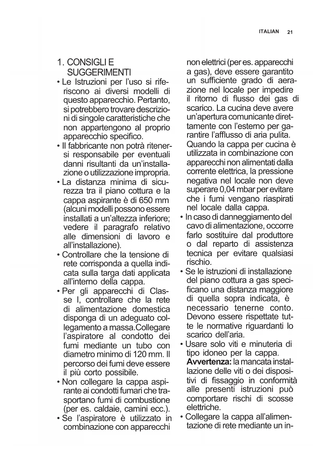 - Non collegare la cappa aspi- rante ai condotti fumari che tra- sportano fumi di combustione (per es. caldaie, camini ecc.).